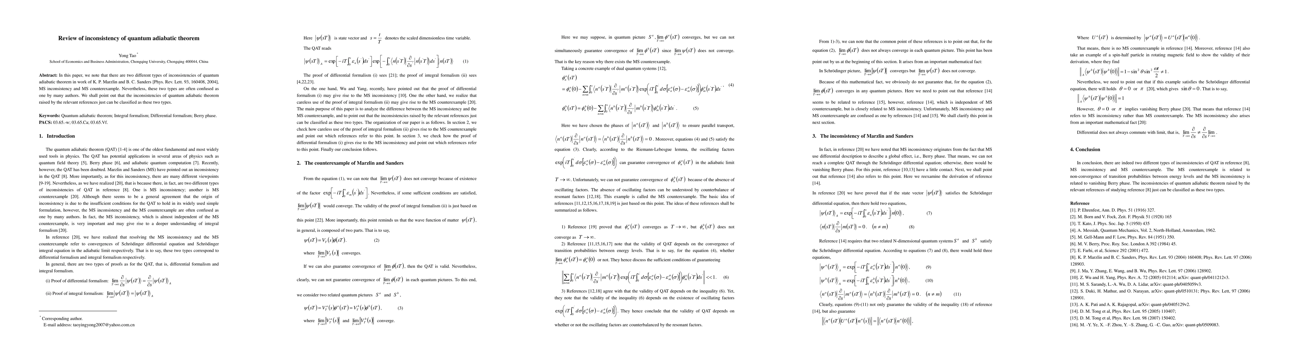 The paper clarifies the distinction between two types of inconsistencies in the quantum adiabatic theorem (QAT): MS inconsistency and MS counterexample, which are often conflated in previous works.