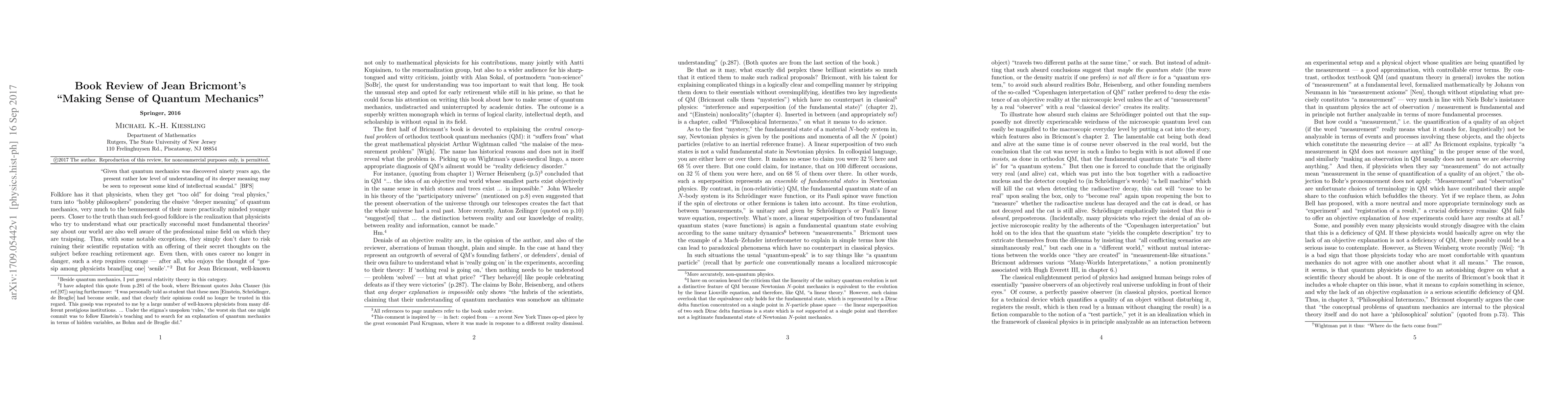 Summary: This review examines Jean Bricmont's book "Making Sense of Quantum Mechanics," assessing its approach to demystifying quantum theory and critiquing the philosophical interpretations often associated with it. Bricmont's work aims to provide a clear, accessible understanding of quantum mechanics for non-specialists.