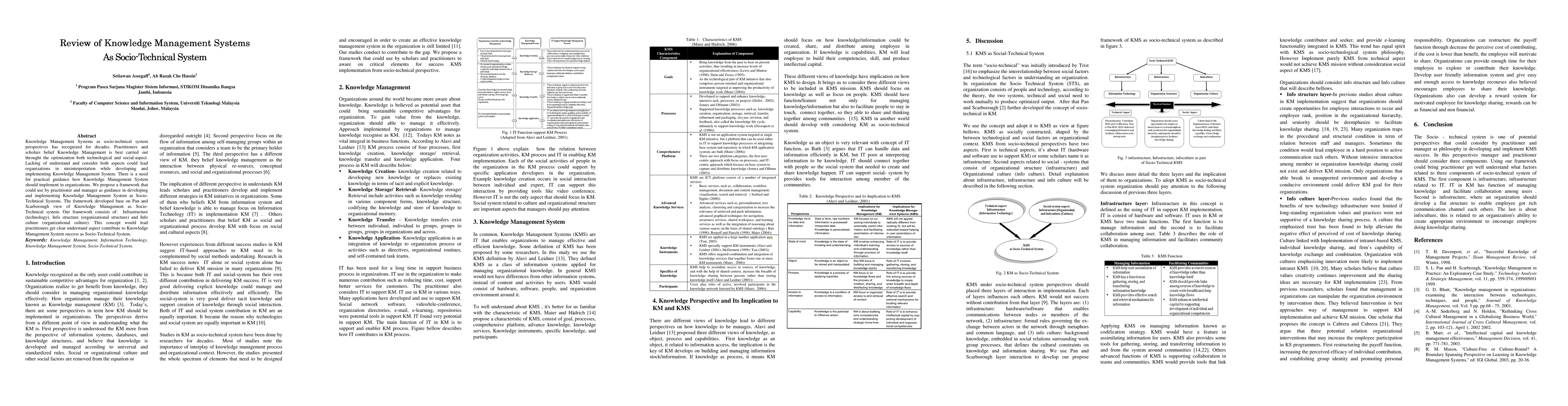 This paper reviews Knowledge Management Systems (KMS) as socio-technical systems, emphasizing the importance of optimizing both technological and social aspects. It proposes a framework based on Pan and Scarborough's views, consisting of infrastructure, info structure, and info culture, to guide practitioners in effectively implementing KMS.