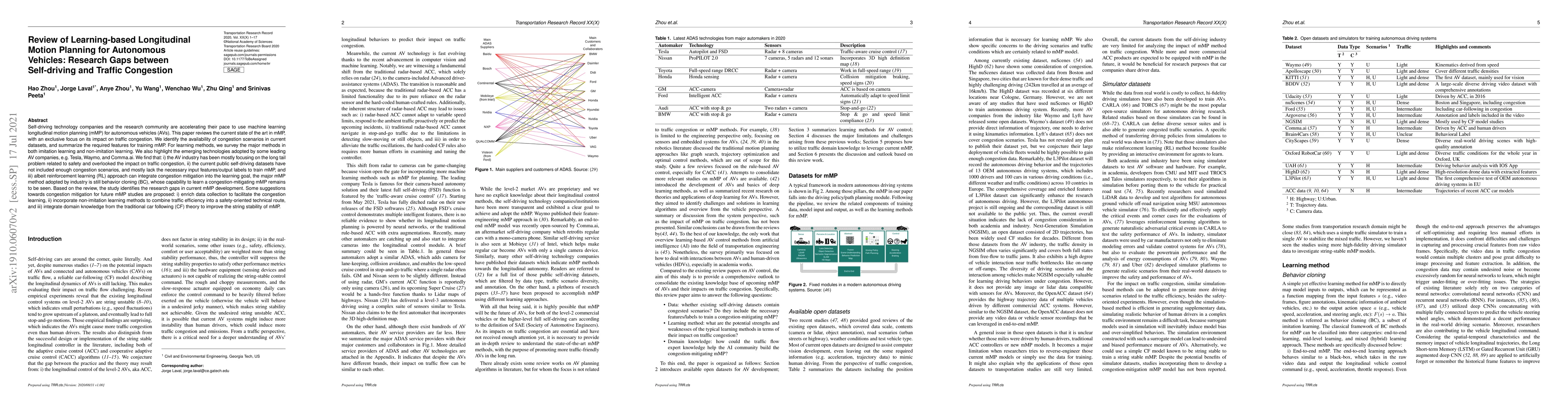 This paper reviews the current state of machine learning longitudinal motion planning for autonomous vehicles, focusing on its impact on traffic congestion. It identifies gaps in current datasets and learning methods, noting that the industry has largely overlooked congestion mitigation despite its importance. The study suggests enriching data collection, incorporating non-imitation learning, and integrating traditional car following theory to improve congestion mitigation strategies.