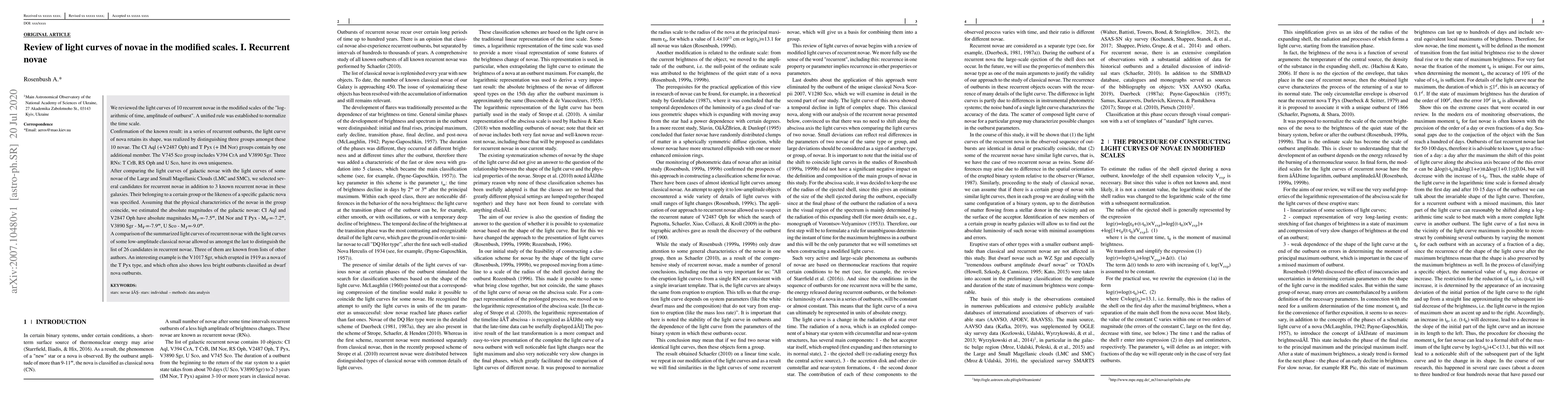 This paper reviews the light curves of 10 recurrent novae in modified logarithmic time-amplitude scales, establishing a unified normalization rule and identifying three distinct groups. It also estimates the absolute magnitudes of several galactic novae and identifies 26 candidates for recurrent novae among low-amplitude classical novae.