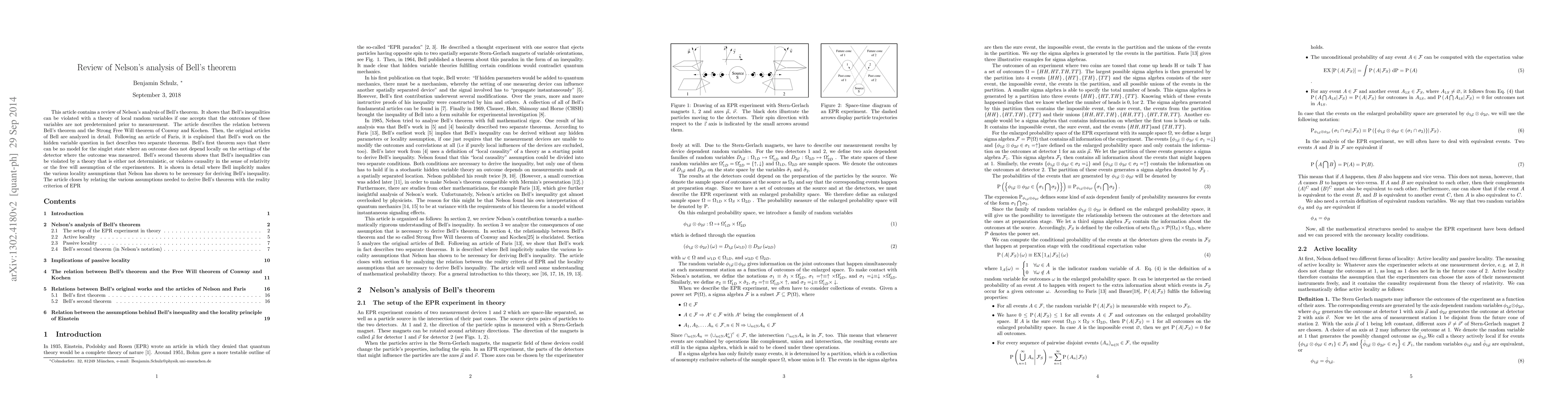 This paper reviews Nelson's analysis of Bell's theorem, demonstrating that Bell's inequalities can be violated under local random variables if measurement outcomes are not predetermined. It also explores the connection between Bell's theorem and the Strong Free Will theorem, and clarifies Bell's two distinct theorems regarding hidden variables and their implications for locality and causality.