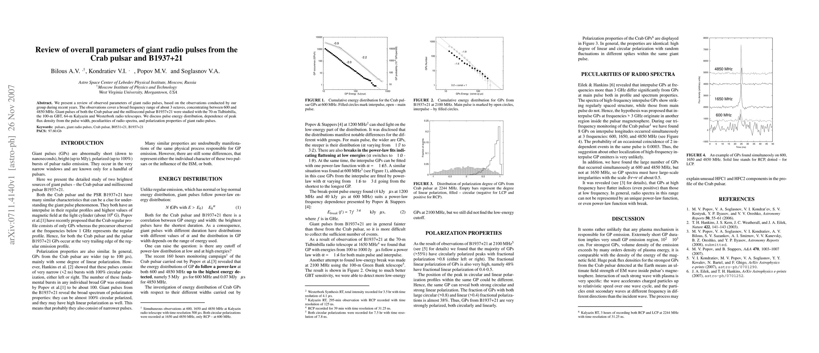 This paper reviews giant radio pulses from the Crab pulsar and B1937+21, observed over a broad frequency range using multiple radio telescopes. It examines pulse energy distribution, peak flux density dependence, radio spectra peculiarities, and polarization properties.