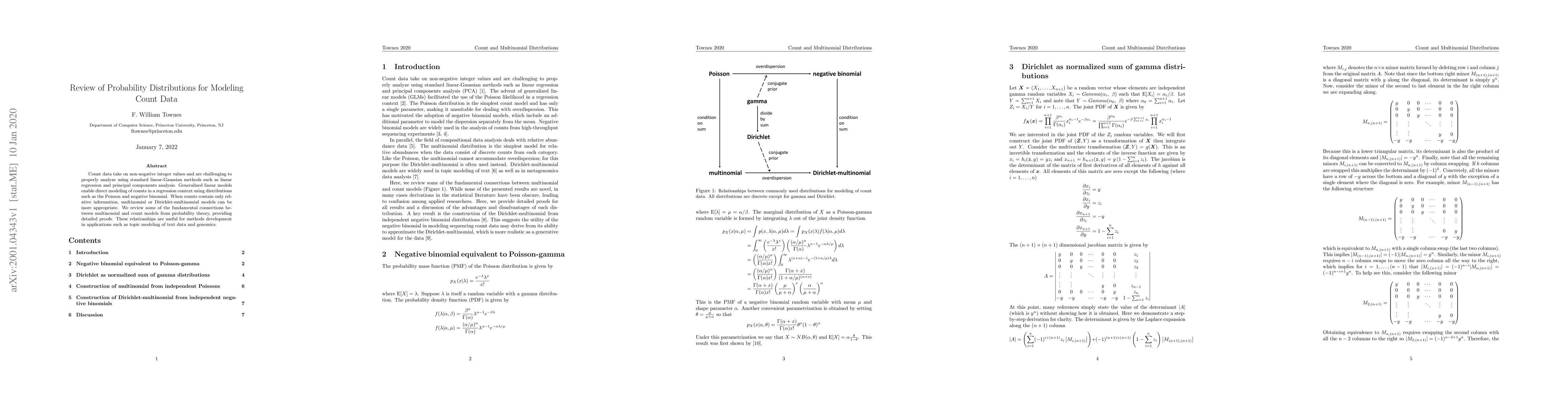 This review paper explores probability distributions for modeling count data, highlighting connections between multinomial and count models from probability theory to support methods development in applications like topic modeling and genomics.