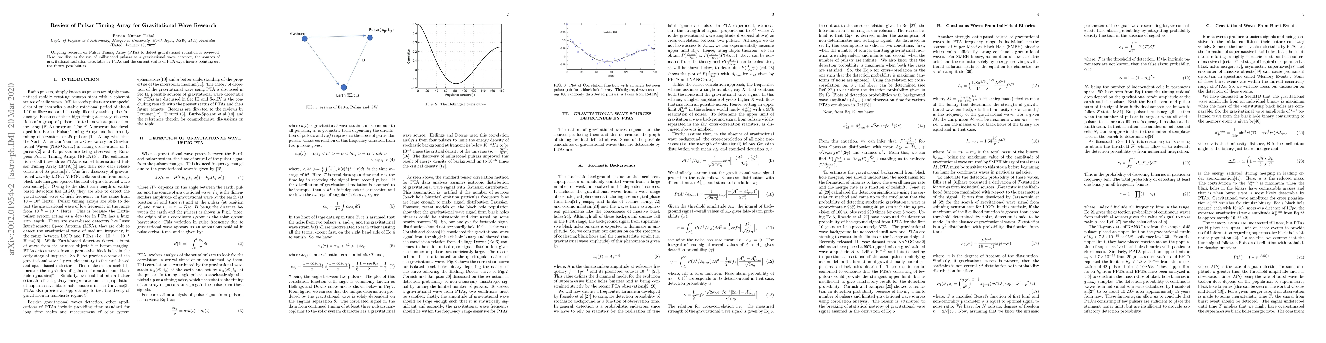 Ongoing research on Pulsar Timing Array (PTA) to detect gravitational radiation is reviewed. Here, we discuss the use of millisecond pulsars as a gravitational wave detector, the sources of gravitational radiation detectable by PTAs and the current status of PTA experiments pointing out the future possibilities.
