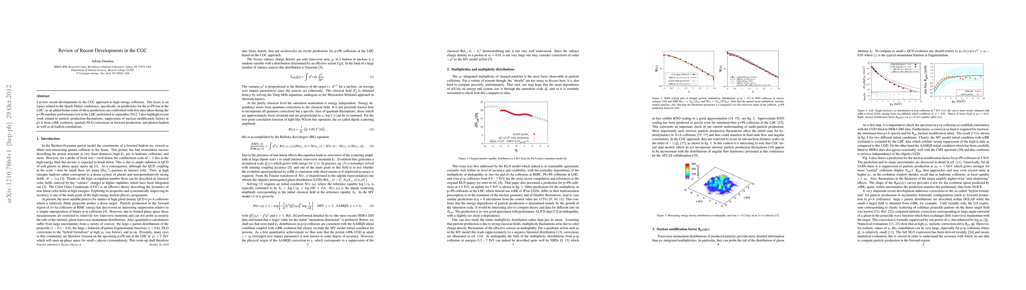 This paper reviews recent advancements in the CGC approach for high-energy collisions, focusing on predictions for the p+Pb run at the LHC and comparing them with initial data from the 2012 machine performance test. It also covers developments in particle production fluctuations, nuclear modification factors, NLO corrections, and photon-hadron and di-hadron correlations.
