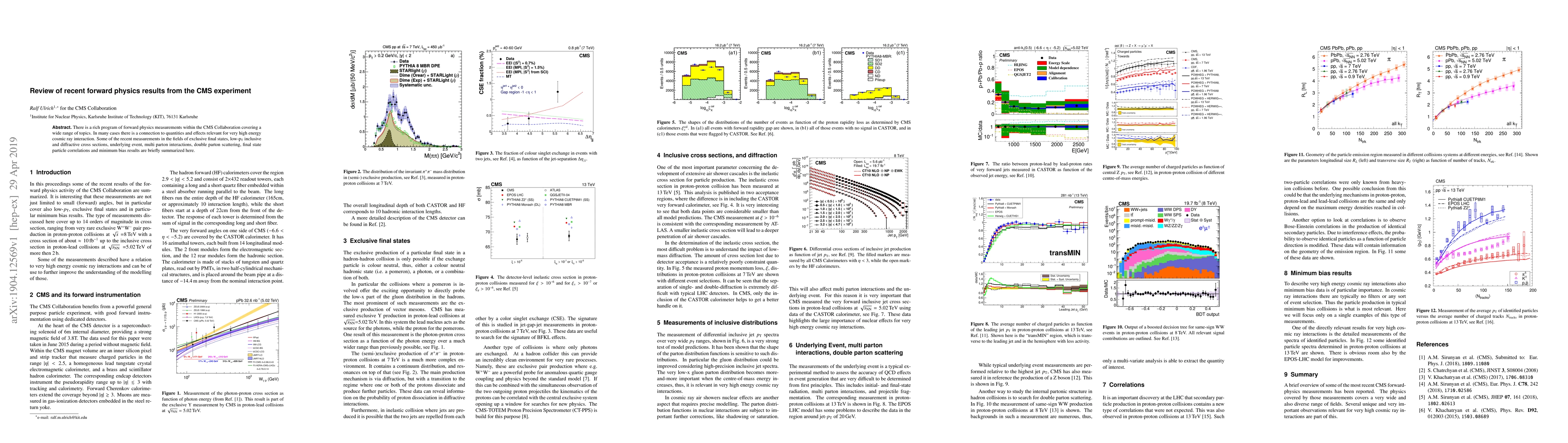 This paper reviews recent forward physics results from the CMS experiment, highlighting measurements in exclusive final states, low-pT inclusive and diffractive cross sections, and connections to high energy cosmic ray interactions. It summarizes findings on underlying event, multi parton interactions, and double parton scattering.