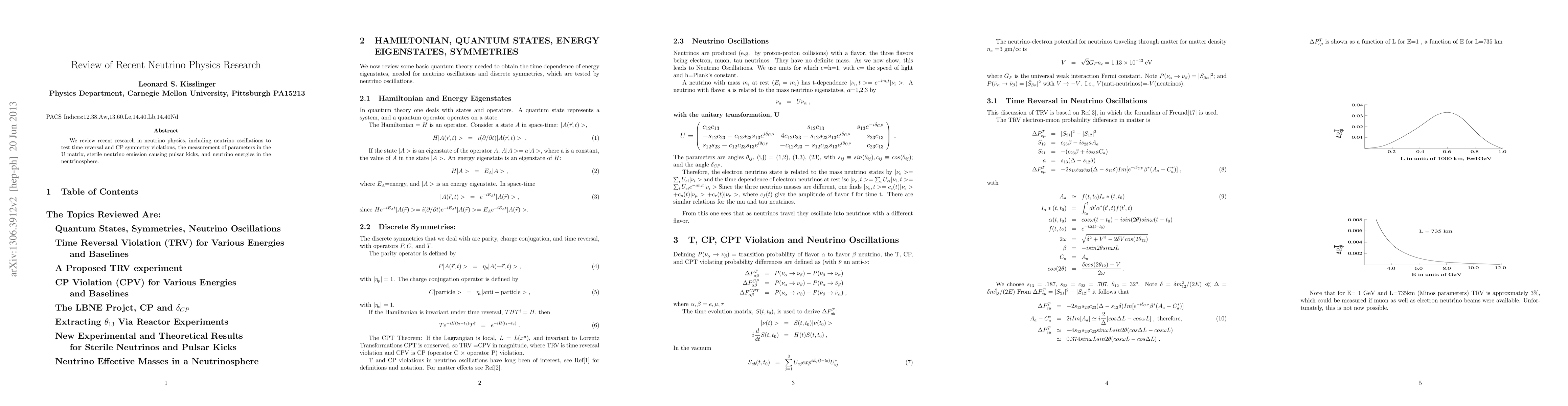 We review recent research in neutrino physics, including neutrino oscillations to test time reversal and CP symmetry violations, the measurement of parameters in the U matrix, sterile neutrino emission causing pulsar kicks, and neutrino energies in the neutrinosphere.