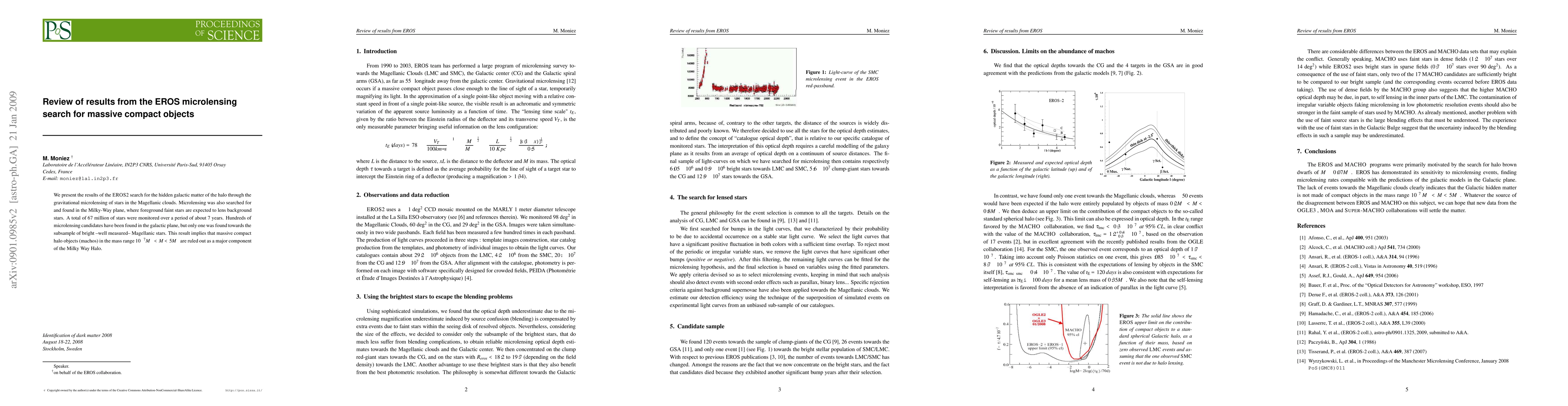 The EROS2 microlensing study of Magellanic Cloud and Milky Way stars over 7 years found only one candidate event in Magellanic stars, ruling out massive compact halo objects as a significant component of the Milky Way Halo.