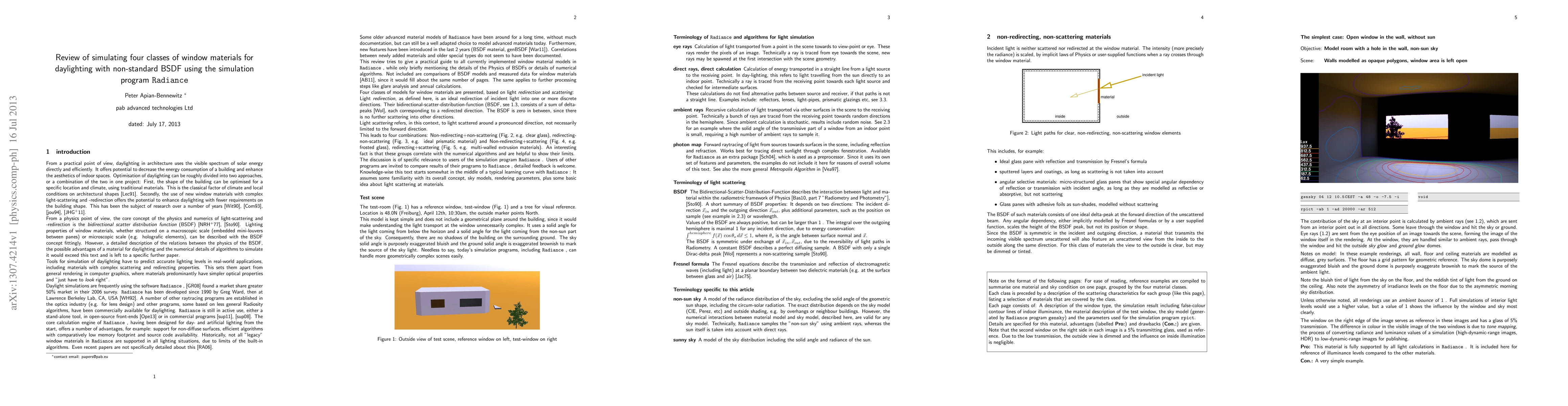 This review examines four window material classes for daylighting simulation using Radiance, detailing their scattering properties and limitations. It demonstrates models via an example indoor scene and sky conditions, aiming to clarify their application in projects or teaching, with broader applicability to other lighting programs.