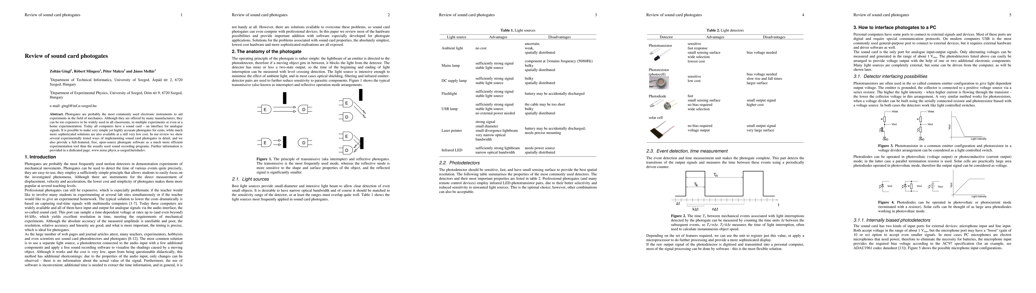 Photogates are probably the most commonly used electronic instruments to aid experiments in the field of mechanics. Although they are offered by many manufacturers, they can be too expensive to be widely used in all classrooms, in multiple experiments or even at a home experimentation. Today all computers have a sound card - an interface for analogue signals. It is possible to make very simple yet highly accurate photogates for cents, while much more sophisticated solutions are also available at a still very low cost. In our review we show several experimentally tested ways of implementing sound card photogates in detail, and we also provide a full-featured, free, open-source photogate software as a much more efficient experimentation tool than the usually used sound recording programs. Further information is provided in a dedicated page, www.noise.physx.u-szeged.hu/edudev.