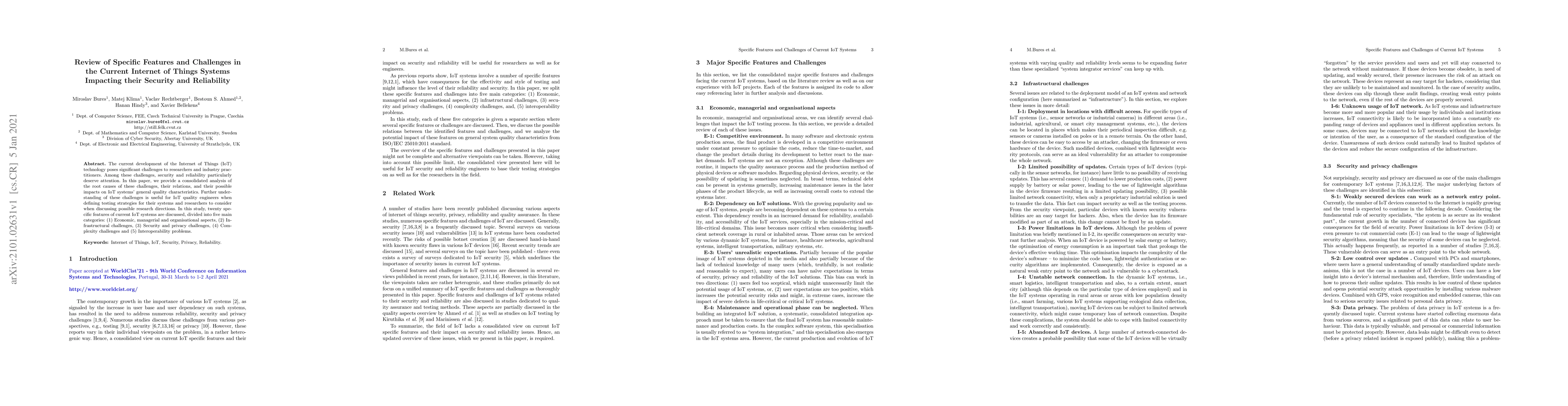 This paper reviews specific features and challenges in current IoT systems, focusing on security and reliability. It categorizes twenty features into five main areas: economic, infrastructural, security, complexity, and interoperability challenges, providing insights for IoT quality engineers and researchers.