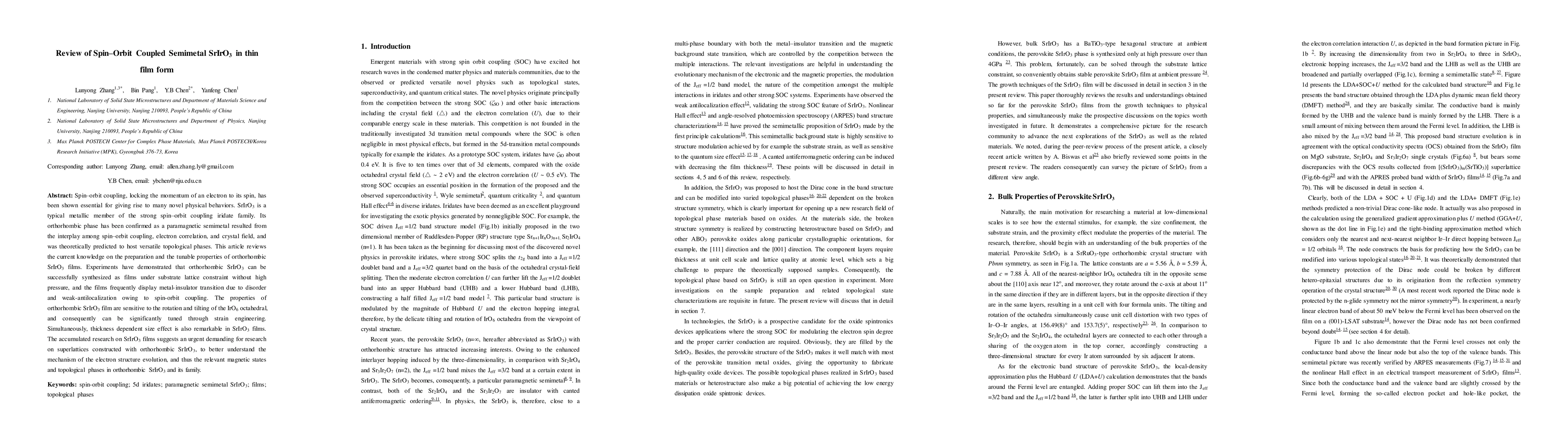 Spin orbit coupling provides a mechanism to lock the momentum of electron to its spin degree, recent years was revealed to be essential in arousing many novel physical behaviors. SrIrO3 is a typical metallic member of the strong spin orbit coupling iridate family. Its orthorhombic phase was confirmed as a particular spin orbit coupling assistant electron correlated semimetal with small electron and hole pockets, and was supposed to host versatile topological phases, with prospect of opening a new topological matter field based on oxides. The existing experiments have demonstrated that orthorhombic SrIrO3 can be easily synthesized at two dimensional scale films under the substrate lattice constraint, and the films display Fermi-liquid behavior in high temperature and generally two dimensional weak localization resulted metal insulator transition. The properties of orthorhombic SrIrO3 film are sensitive to the rotation and tilting angle, as well as the interlayer coupling of the IrO6 octahedras, consequently can be tuned through substrate strain engineering and size scale. For example, the film was approached a state similar to Sr2IrO4 at the ultrathin limit to several unit cell, becoming a canted antiferromagnetic semiconductor/insulator. The existing knowledges suggest urgent demands of researches on the superlattices constructed with orthorhombic SrIrO3, for further understanding the evolution mechanism of the electron structure, and so the relevant magnetic state and topological phases in the orthorhombic SrIrO3 and its family.