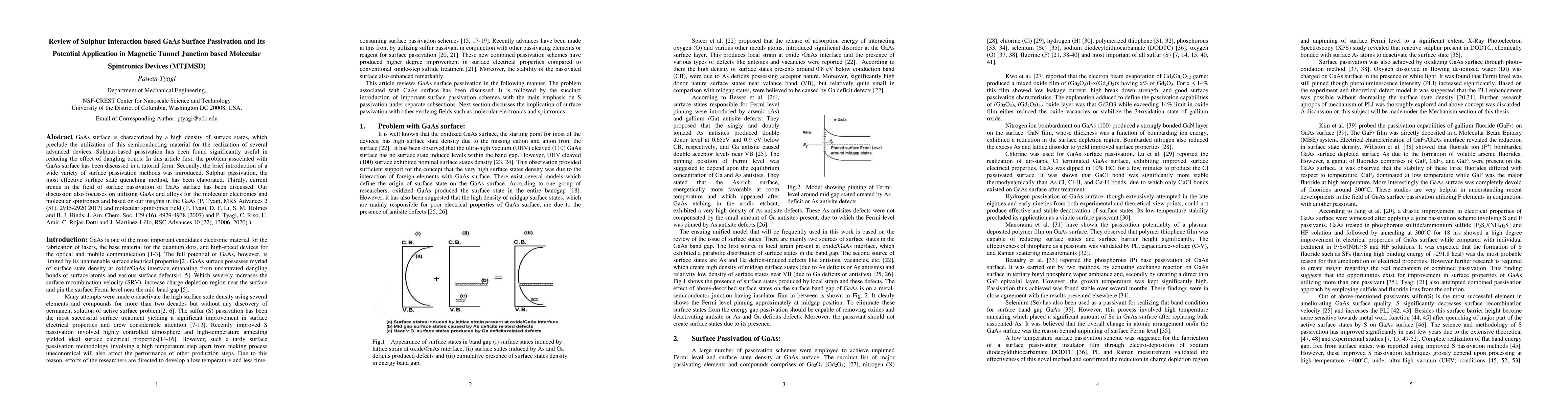 This paper reviews sulfur-based passivation methods for GaAs surfaces to mitigate high surface state densities, enhancing material usability for advanced devices. It elaborates on sulfur passivation's effectiveness and discusses its potential application in molecular spintronics devices, particularly in magnetic tunnel junction-based systems.