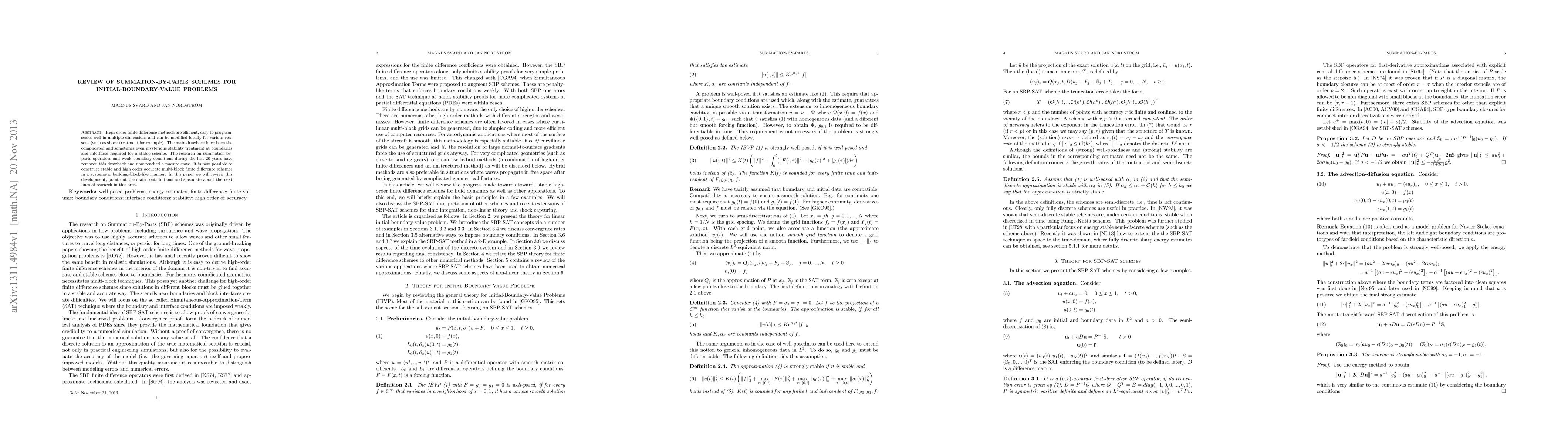 This paper reviews the development of summation-by-parts schemes for high-order finite difference methods, addressing the stability issues at boundaries and interfaces. It highlights the advancements made over the last two decades and discusses future research directions.