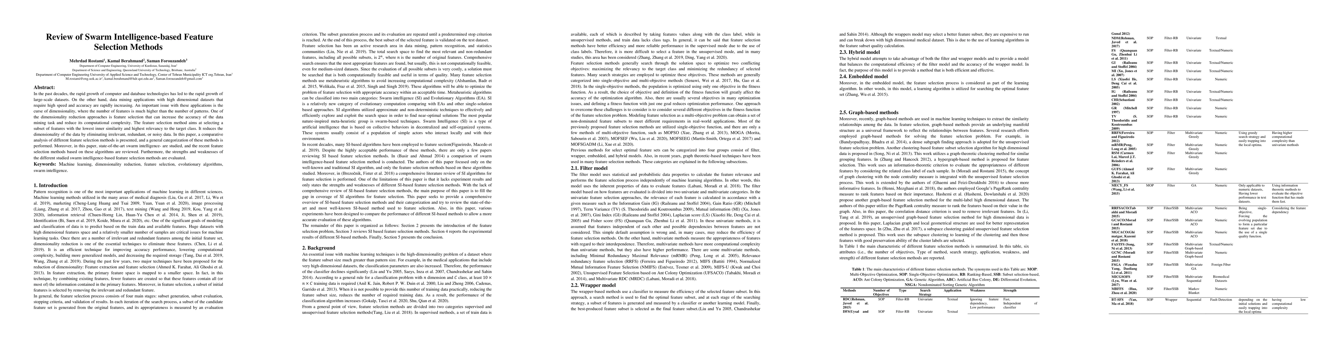 This paper reviews swarm intelligence-based feature selection methods to address the curse of dimensionality in high-dimensional datasets. It evaluates various swarm intelligence algorithms and their comparative strengths and weaknesses in feature selection.