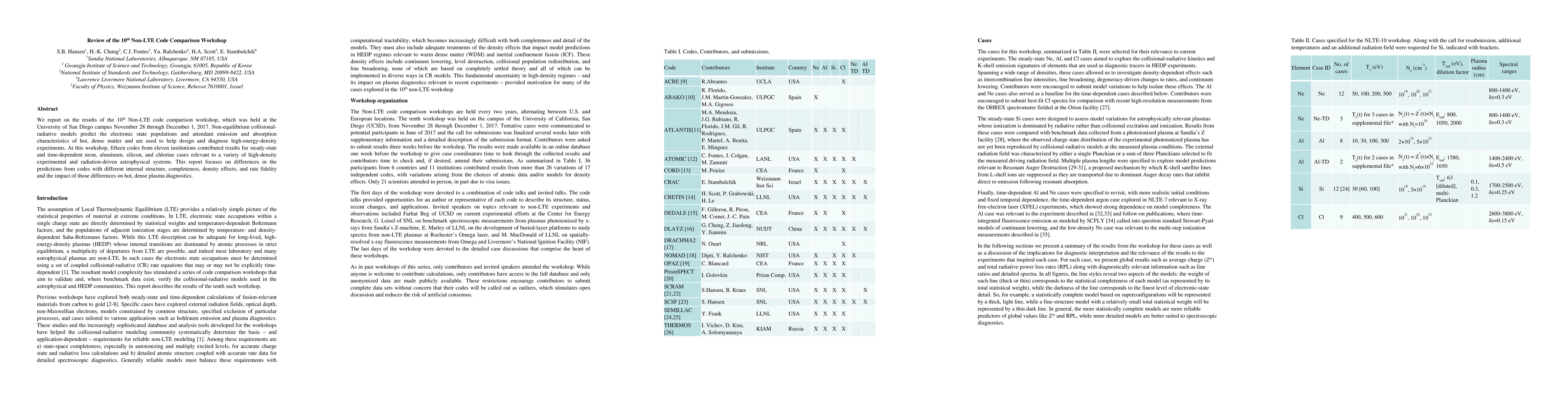 We report on the results of the 10th Non-LTE code comparison workshop, which was held at the University of San Diego campus November 28 through December 1, 2017. Non-equilibrium collisional-radiative models predict the electronic state populations and attendant emission and absorption characteristics of hot, dense matter and are used to help design and diagnose high-energy-density experiments. At this workshop, fifteen codes from eleven institutions contributed results for steady-state and time-dependent neon, aluminum, silicon, and chlorine cases relevant to a variety of high-density experimental and radiation-driven astrophysical systems. This report focuses on differences in the predictions from codes with different internal structure, completeness, density effects, and rate fidelity and the impact of those differences on hot, dense plasma diagnostics.
