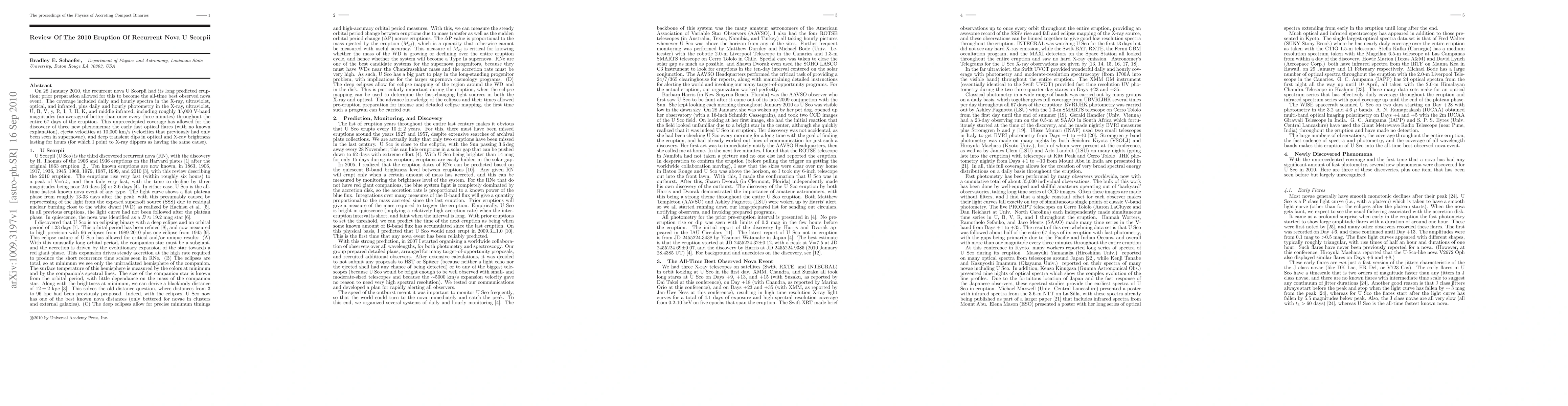 The 2010 eruption of recurrent nova U Scorpii was the most extensively observed nova event, revealing three new phenomena: early fast optical flares, ejecta velocities up to 10,000 km/s, and deep transient dips in optical and X-ray brightness. This unprecedented coverage provided valuable insights into nova behavior.