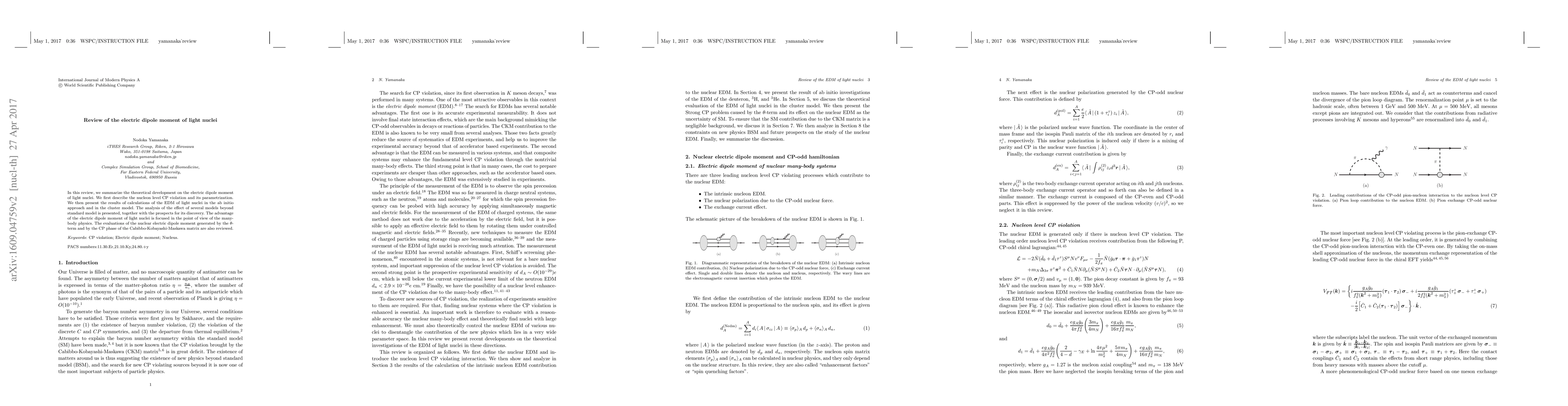 In this review, we summarize the theoretical development on the electric dipole moment of light nuclei. We first describe the nucleon level CP violation and its parametrization. We then present the results of calculations of the EDM of light nuclei in the ab initio approach and in the cluster model. The analysis of the effect of several models beyond standard model is presented, together with the prospects for its discovery. The advantage of the electric dipole moment of light nuclei is focused in the point of view of the many-body physics. The evaluations of the nuclear electric dipole moment generated by the $\theta$-term and by the CP phase of the Cabibbo-Kobayashi-Maskawa matrix are also reviewed.