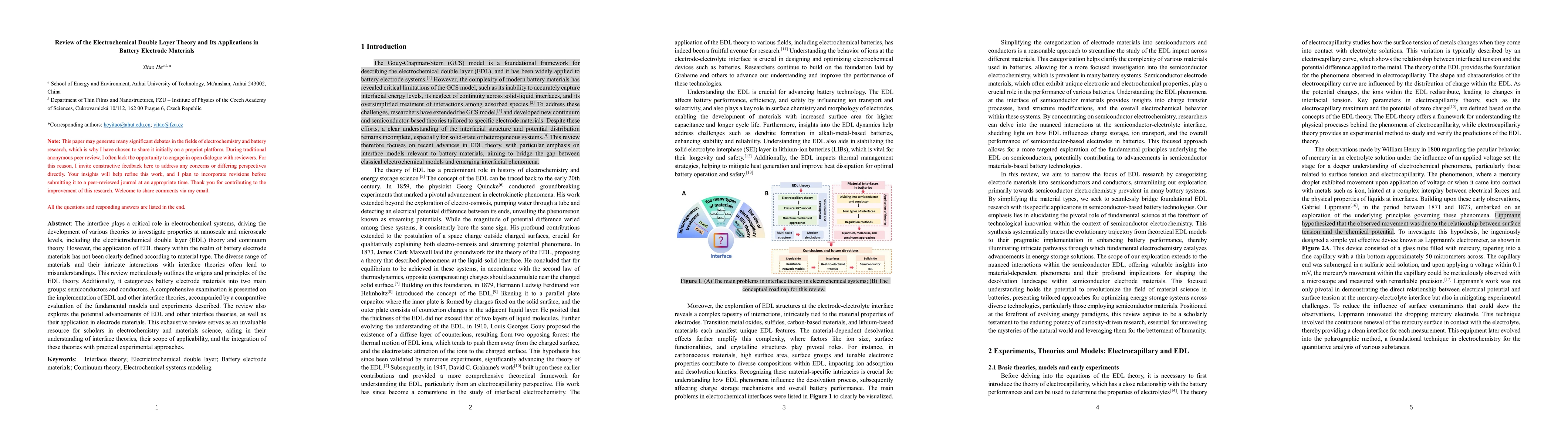 The paper provides a comprehensive review of the electrochemical double layer (EDL) theory and its applications in battery electrode materials, categorizing materials into semiconductors and conductors, and comparing various models and experiments.