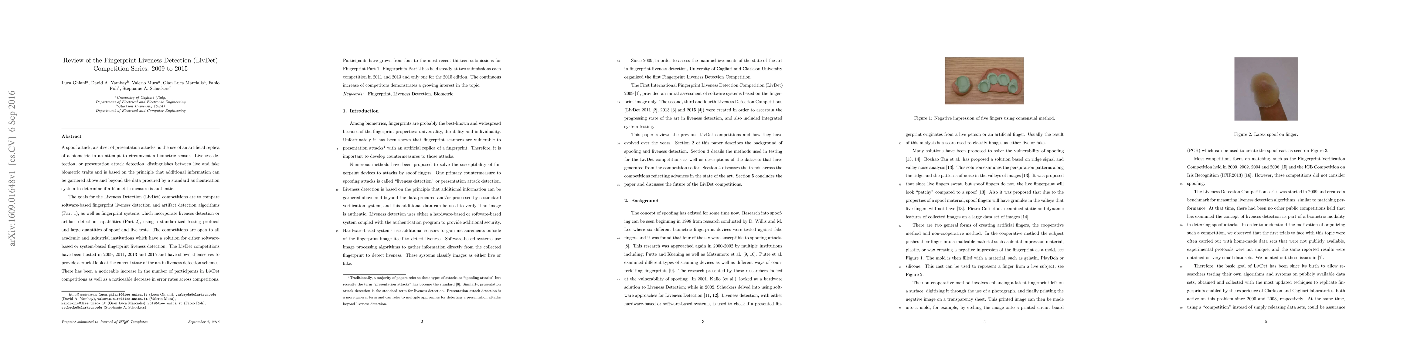 A spoof attack, a subset of presentation attacks, is the use of an artificial replica of a biometric in an attempt to circumvent a biometric sensor. Liveness detection, or presentation attack detection, distinguishes between live and fake biometric traits and is based on the principle that additional information can be garnered above and beyond the data procured by a standard authentication system to determine if a biometric measure is authentic. The goals for the Liveness Detection (LivDet) competitions are to compare software-based fingerprint liveness detection and artifact detection algorithms (Part 1), as well as fingerprint systems which incorporate liveness detection or artifact detection capabilities (Part 2), using a standardized testing protocol and large quantities of spoof and live tests. The competitions are open to all academic and industrial institutions which have a solution for either softwarebased or system-based fingerprint liveness detection. The LivDet competitions have been hosted in 2009, 2011, 2013 and 2015 and have shown themselves to provide a crucial look at the current state of the art in liveness detection schemes. There has been a noticeable increase in the number of participants in LivDet competitions as well as a noticeable decrease in error rates across competitions. Participants have grown from four to the most recent thirteen submissions for Fingerprint Part 1. Fingerprints Part 2 has held steady at two submissions each competition in 2011 and 2013 and only one for the 2015 edition. The continuous increase of competitors demonstrates a growing interest in the topic.