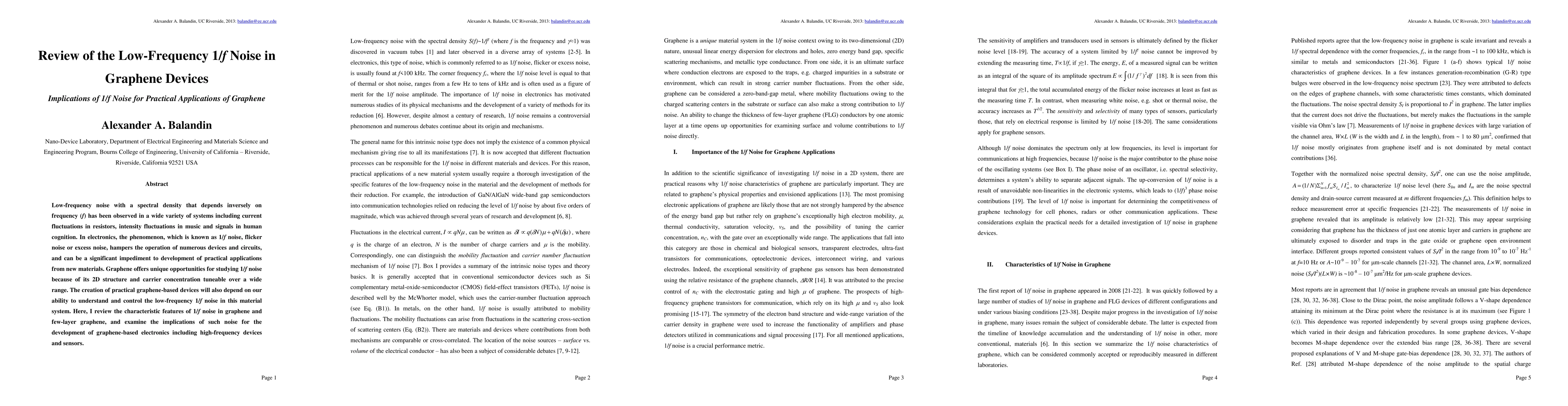 This paper reviews the unique characteristics of low-frequency 1/f noise in graphene and few-layer graphene devices, emphasizing its implications for the development of practical graphene-based electronics, including high-frequency devices and sensors. Understanding and controlling this noise is crucial for advancing graphene applications.