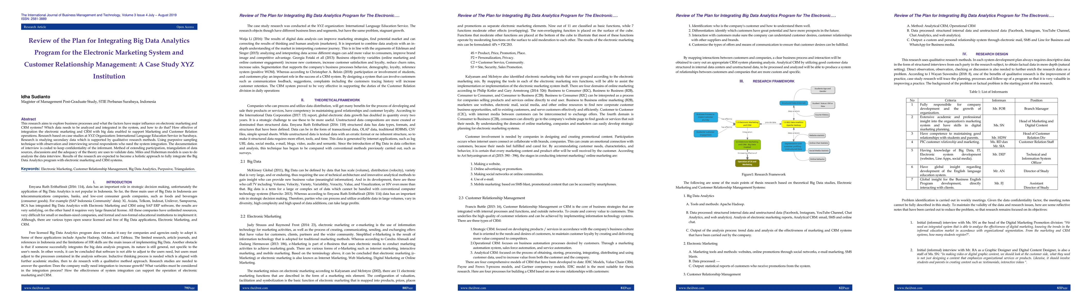 This research aims to explore business processes and what the factors have major influence on electronic marketing and CRM systems? Which data needs to be analyzed and integrated in the system, and how to do that? How effective of integration the electronic marketing and CRM with big data enabled to support Marketing and Customer Relation operations. Research based on case studies at XYZ Organization: International Language Education Service in Surabaya. Research is studying secondary data which is supported by qualitative research methods. Using purposive sampling technique with observation and interviewing several respondents who need the system integration. The documentation of interview is coded to keep confidentiality of the informant. Method of extending participation, triangulation of data sources, discussions and the adequacy of the theory are uses to validate data. Miles and Huberman models is uses to do analysis the data interview. Results of the research are expected to become a holistic approach to fully integrate the Big Data Analytics program with electronic marketing and CRM systems.