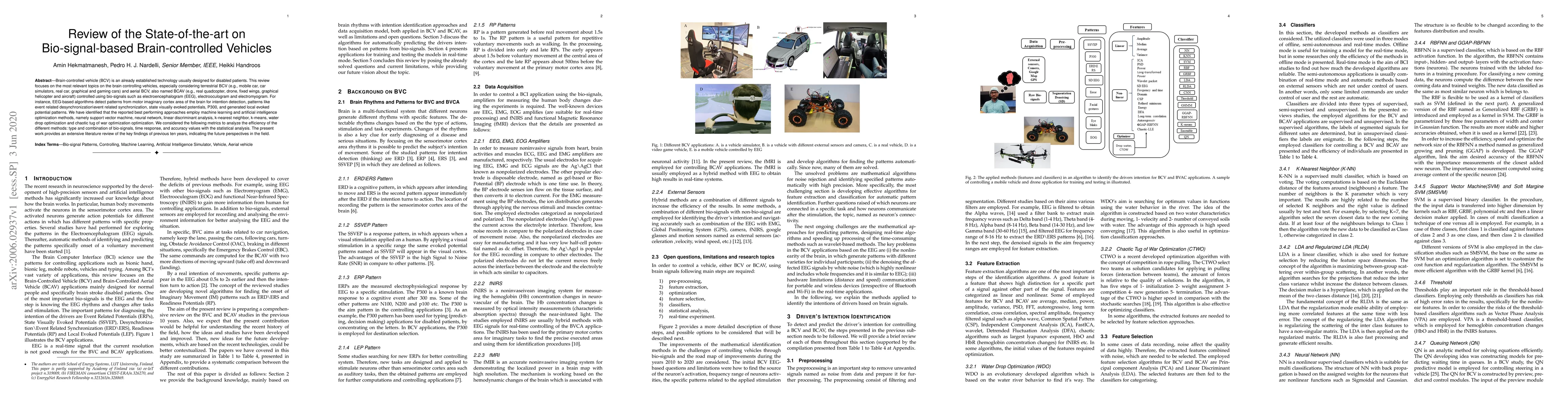 Brain-controlled vehicle (BCV) is an already established technology usually designed for disabled patients. This review focuses on the most relevant topics on the brain controlling vehicles, especially considering terrestrial BCV (e.g., mobile car, car simulators, real car, graphical and gaming cars) and aerial BCV, also named BCAV (e.g., real quadcopter, drone, fixed wings, graphical helicopter and aircraft) controlled using bio-signals such as electroencephalogram (EEG), electrooculogram and electromyogram. For instance, EEG-based algorithms detect patterns from motor imaginary cortex area of the brain for intention detection, patterns like event related desynchronization/event related synchronization, state visually evoked potentials, P300, and generated local evoked potential patterns. We have identified that the reported best performing approaches employ machine learning and artificial intelligence optimization methods, namely support vector machine, neural network, linear discriminant analysis, k-nearest neighbor, k-means, water drop optimization and chaotic tug of war optimization optimization. We considered the following metrics to analyze the efficiency of the different methods: type and combination of bio-signals, time response, and accuracy values with the statistical analysis. The present work provides an extensive literature review of the key findings of previous ten years, indicating the future perspectives in the field.