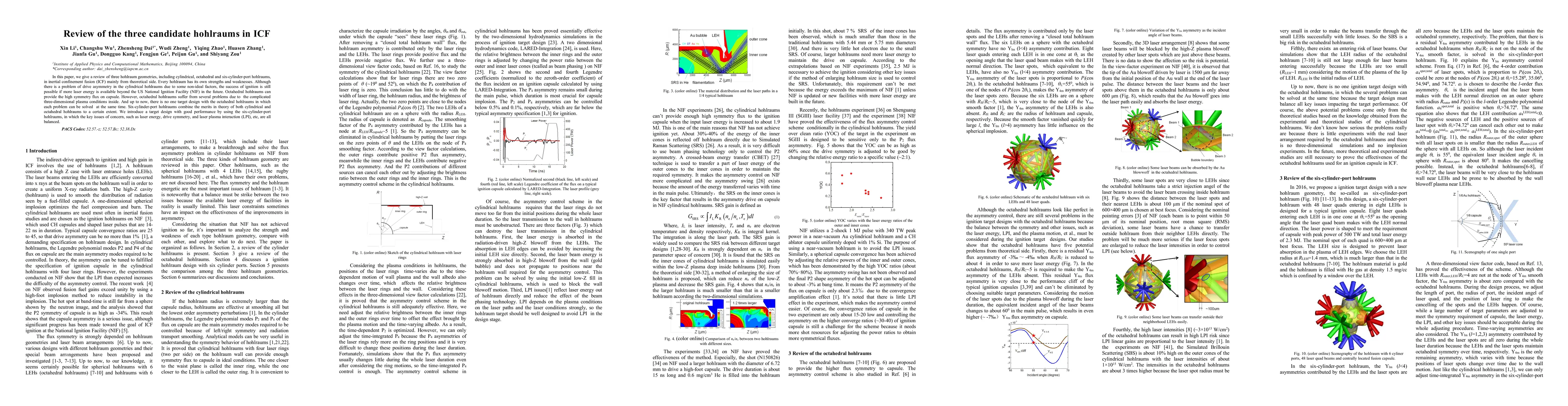 This paper reviews three hohlraum geometries—cylindrical, octahedral, and six-cylinder-port—in inertial confinement fusion (ICF), highlighting their theoretical strengths and weaknesses. While cylindrical hohlraums face drive asymmetry issues, octahedral hohlraums offer high symmetry but suffer from complex plasma conditions. Six-cylinder-port hohlraums aim to balance the merits of both, presenting a well-designed target with balanced laser energy, symmetry, and plasma interaction.