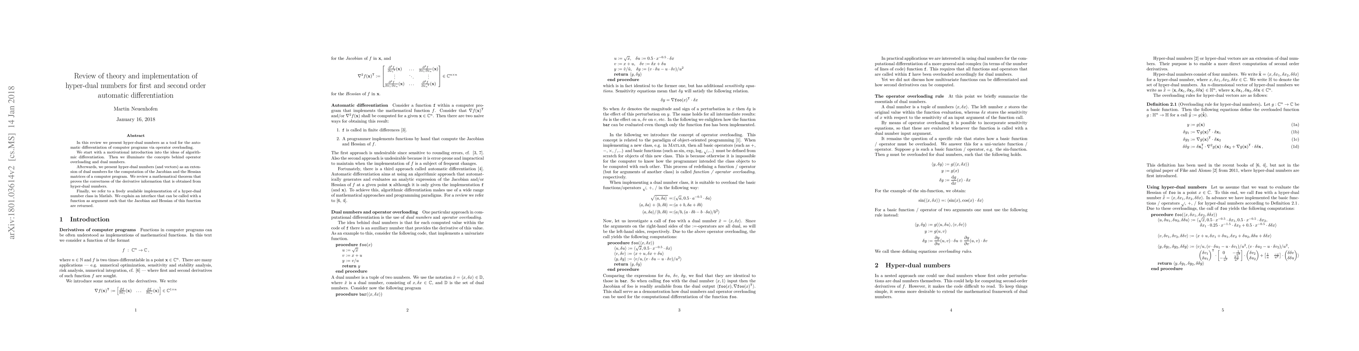 This paper reviews hyper-dual numbers as a method for automatic differentiation, extending dual numbers to compute Jacobian and Hessian matrices. It includes a mathematical proof for the correctness of the derived information and references a Matlab implementation for practical use.