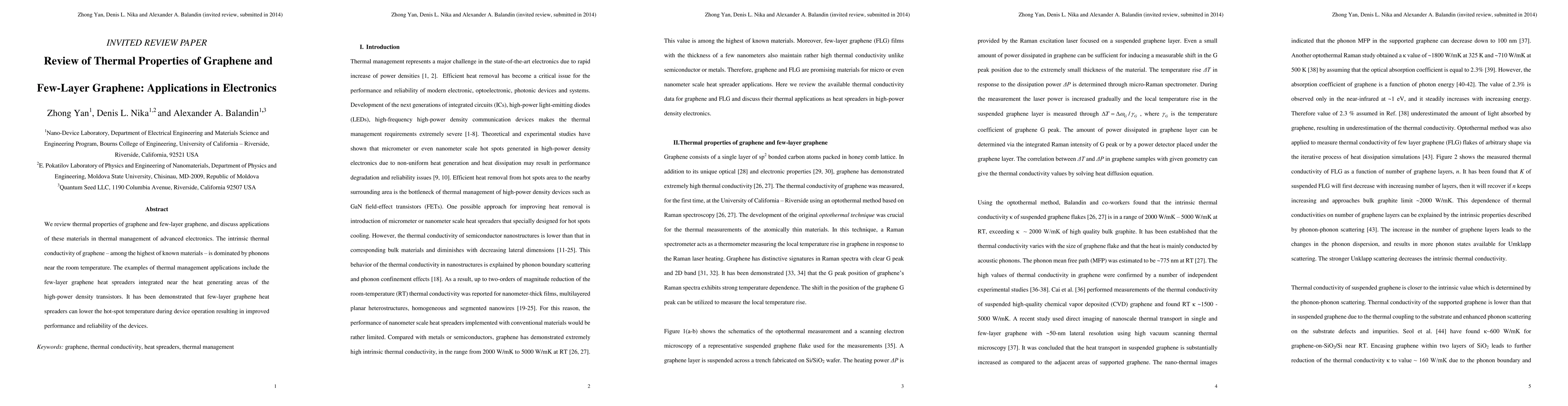 This paper reviews the high thermal conductivity of graphene and few-layer graphene, primarily due to phonons, and explores their applications in electronic thermal management, particularly in reducing hot-spot temperatures for high-power density transistors.