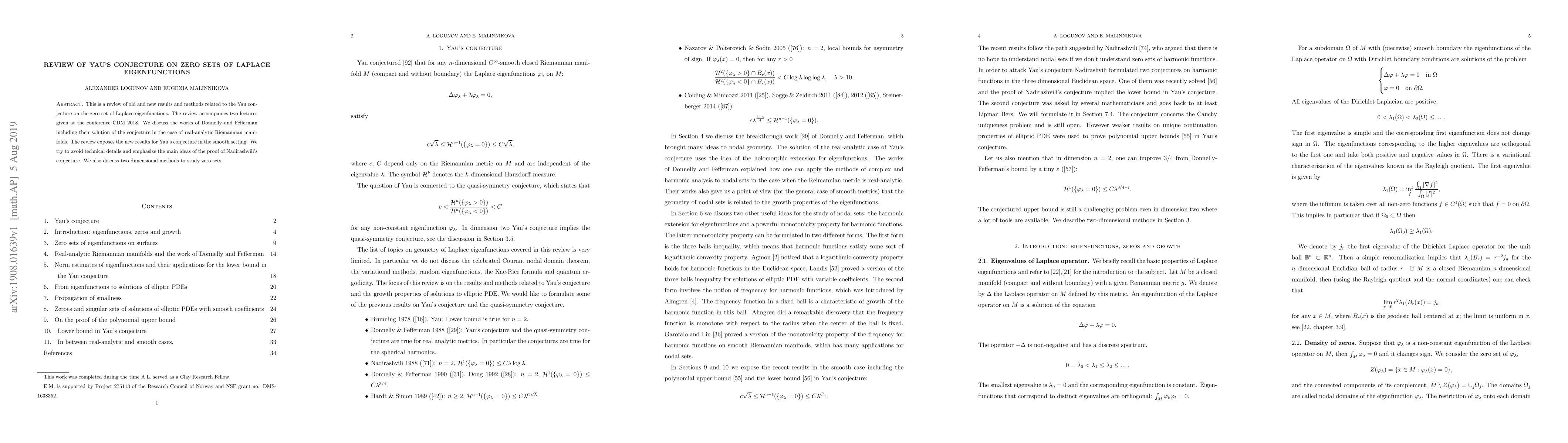 This is a review of old and new results and methods related to the Yau conjecture on the zero set of Laplace eigenfunctions. The review accompanies two lectures given at the conference CDM 2018. We discuss the works of Donnelly and Fefferman including their solution of the conjecture in the case of real-analytic Riemannian manifolds. The review exposes the new results for Yau's conjecture in the smooth setting. We try to avoid technical details and emphasize the main ideas of the proof of Nadirashvili's conjecture. We also discuss two-dimensional methods to study zero sets.