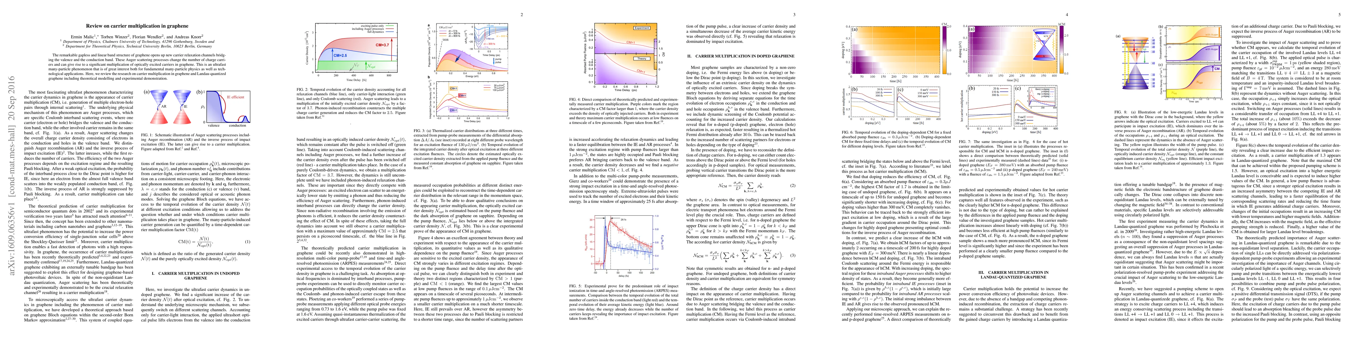 This paper reviews carrier multiplication in graphene, highlighting how its unique band structure enables Auger scattering processes that multiply optically excited carriers rapidly, with implications for both fundamental physics and technological advancements. It covers theoretical modeling and experimental evidence of this phenomenon in graphene and Landau-quantized graphene.