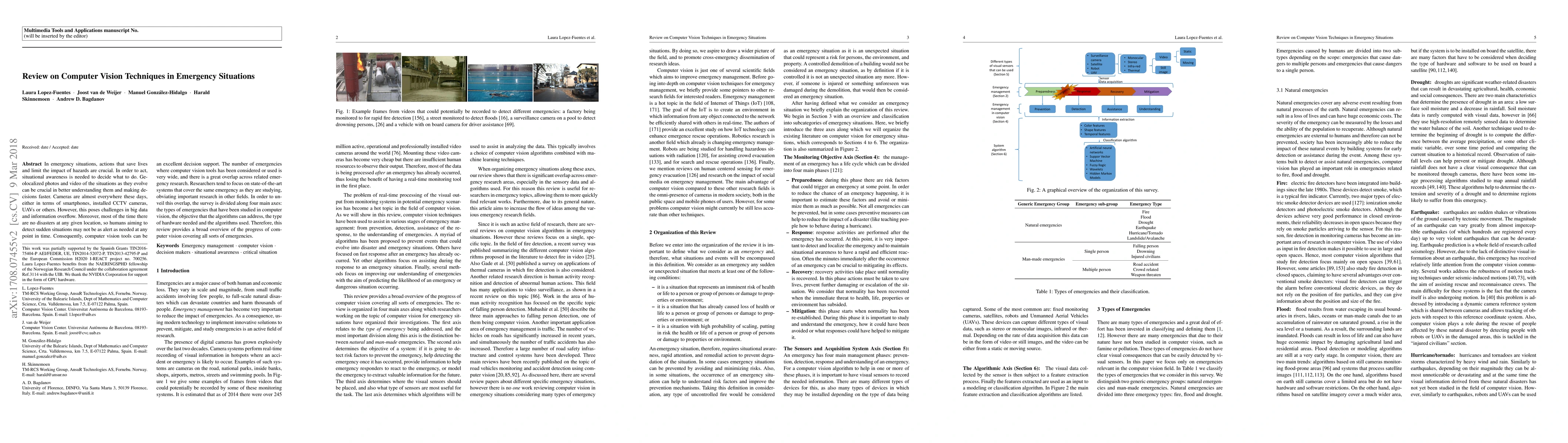 In emergency situations, actions that save lives and limit the impact of hazards are crucial. In order to act, situational awareness is needed to decide what to do. Geolocalized photos and video of the situations as they evolve can be crucial in better understanding them and making decisions faster. Cameras are almost everywhere these days, either in terms of smartphones, installed CCTV cameras, UAVs or others. However, this poses challenges in big data and information overflow. Moreover, most of the time there are no disasters at any given location, so humans aiming to detect sudden situations may not be as alert as needed at any point in time. Consequently, computer vision tools can be an excellent decision support. The number of emergencies where computer vision tools has been considered or used is very wide, and there is a great overlap across related emergency research. Researchers tend to focus on state-of-the-art systems that cover the same emergency as they are studying, obviating important research in other fields. In order to unveil this overlap, the survey is divided along four main axes: the types of emergencies that have been studied in computer vision, the objective that the algorithms can address, the type of hardware needed and the algorithms used. Therefore, this review provides a broad overview of the progress of computer vision covering all sorts of emergencies.