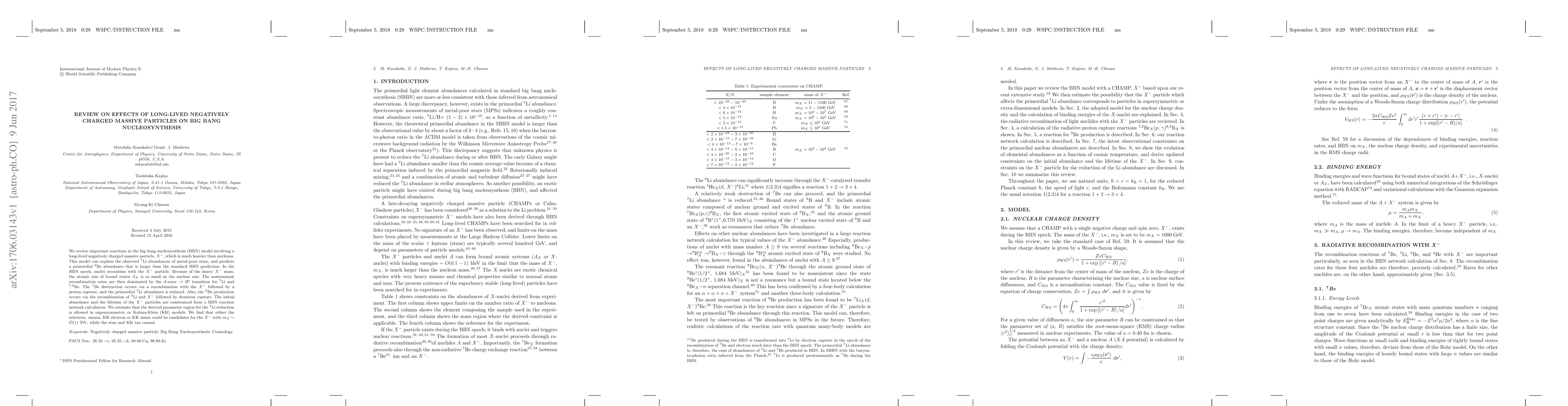 This review explores the impact of long-lived negatively charged massive particles (X^-) on Big Bang Nucleosynthesis (BBN). It suggests that X^- particles, much heavier than nucleons, can explain observed 7Li abundances in metal-poor stars and predict a larger primordial 9Be abundance. The study focuses on nonresonant recombination rates, particularly d-wave transitions for 7Li and 7,9Be, and constraints the X^- particle's initial abundance and lifetime. It identifies potential X^- candidates in supersymmetric or Kaluza-Klein models, such as selectron, smuon, KK electron, or KK muon, with a mass around 1 TeV.