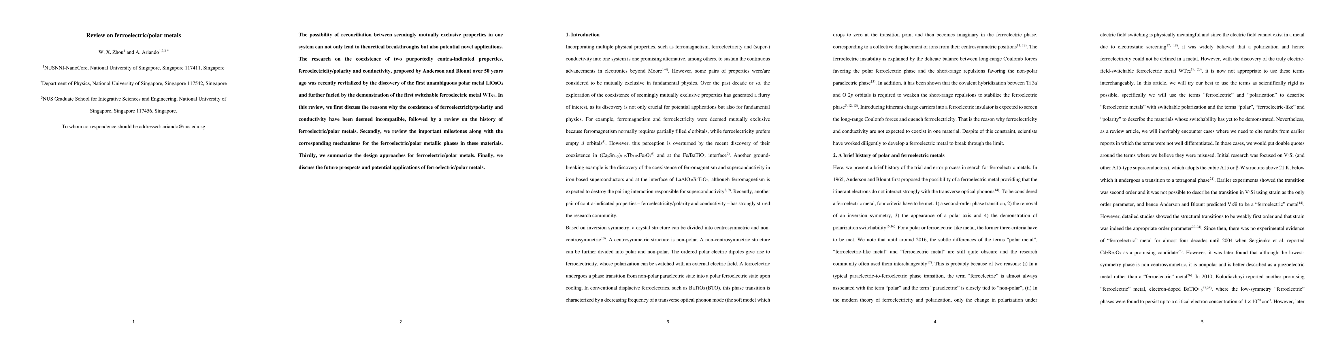 The possibility of reconciliation between seemingly mutually exclusive properties in one system can not only lead to theoretical breakthroughs but also potential novel applications. The research on the coexistence of two purportedly contra-indicated properties, ferroelectricity/polarity and conductivity, proposed by Anderson and Blount over 50 years ago was recently revitalized by the discovery of the first unambiguous polar metal LiOsO3 and further fueled by the demonstration of the first switchable ferroelectric metal WTe2. In this review, we first discuss the reasons why the coexistence of ferroelectricity/polarity and conductivity have been deemed incompatible, followed by a review on the history of ferroelectric/polar metals. Secondly, we review the important milestones along with the corresponding mechanisms for the ferroelectric/polar metallic phases in these materials. Thirdly, we summarize the design approaches for ferroelectric/polar metals. Finally, we discuss the future prospects and potential applications of ferroelectric/polar metals.