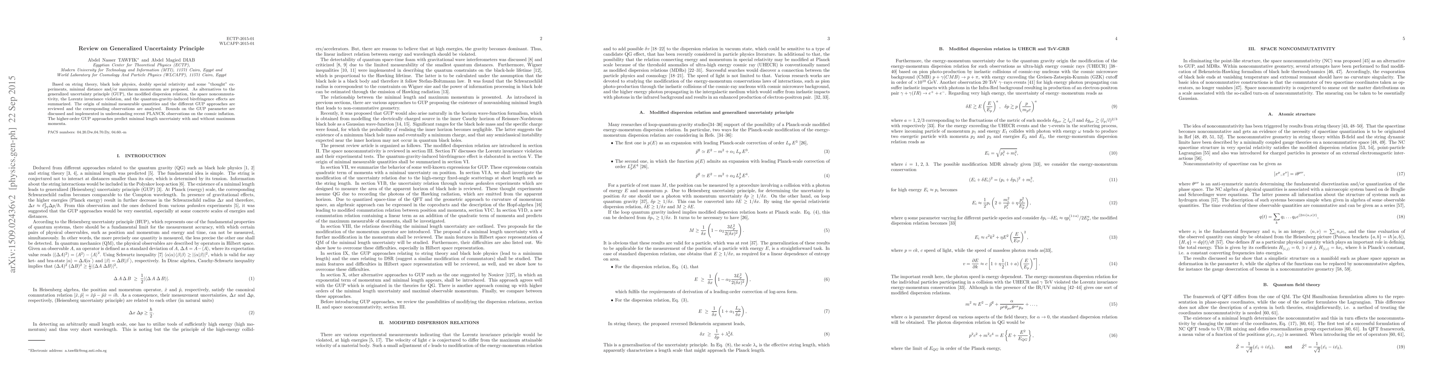 This paper reviews the generalized uncertainty principle (GUP) based on string theory and black hole physics, exploring alternatives like modified dispersion relations and space noncommutativity. It analyzes observational bounds on GUP parameters and their implications for recent PLANCK data on cosmic inflation.