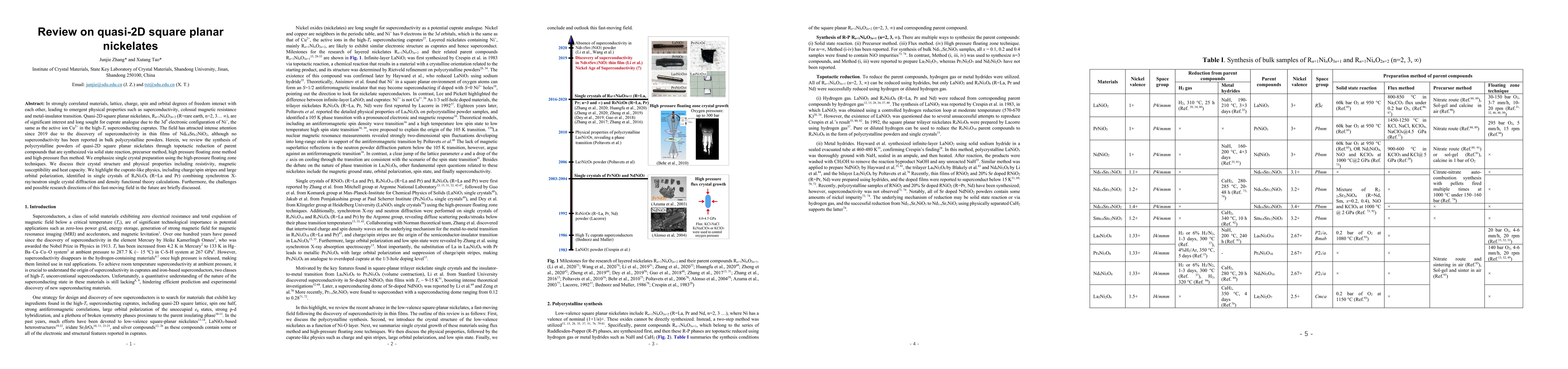 This review paper explores quasi-2D square planar nickelates, a class of materials that could serve as analogues for high-Tc superconducting cuprates due to their similar electronic configuration. The paper discusses the synthesis and physical properties of these materials, highlighting potential for charge/spin stripes and large orbital polarization.