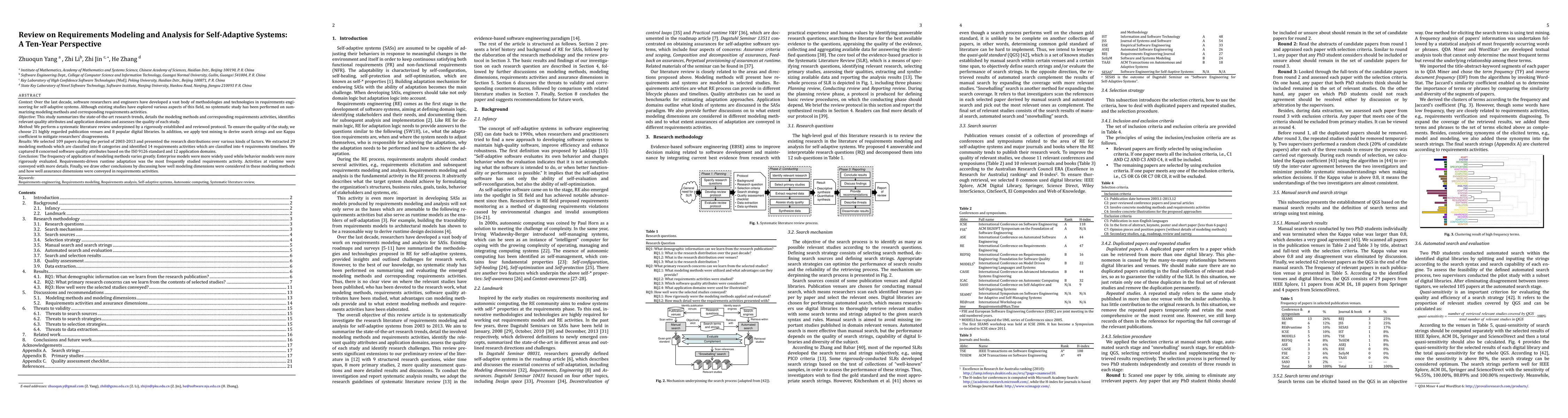 Context: Over the last decade, software researchers and engineers have developed a vast body of methodologies and technologies in requirements engineering for self-adaptive systems. Although existing studies have explored various aspects of this field, no systematic study has been performed on summarizing modeling methods and corresponding requirements activities. Objective: This study summarizes the state-of-the-art research trends, details the modeling methods and corresponding requirements activities, identifies relevant quality attributes and application domains and assesses the quality of each study. Method: We perform a systematic literature review underpinned by a rigorously established and reviewed protocol. To ensure the quality of the study, we choose 21 highly regarded publication venues and 8 popular digital libraries. In addition, we apply text mining to derive search strings and use Kappa coefficient to mitigate disagreements of researchers. Results: We selected 109 papers during the period of 2003-2013 and presented the research distributions over various kinds of factors. We extracted 29 modeling methods which are classified into 8 categories and identified 14 requirements activities which are classified into 4 requirements timelines. We captured 8 concerned software quality attributes based on the ISO 9126 standard and 12 application domains. Conclusion: The frequency of application of modeling methods varies greatly. Enterprise models were more widely used while behavior models were more rigorously evaluated. Requirements-driven runtime adaptation was the most frequently studied requirements activity. Activities at runtime were conveyed with more details. Finally, we draw other conclusions by discussing how well modeling dimensions were considered in these modeling methods and how well assurance dimensions were conveyed in requirements activities.