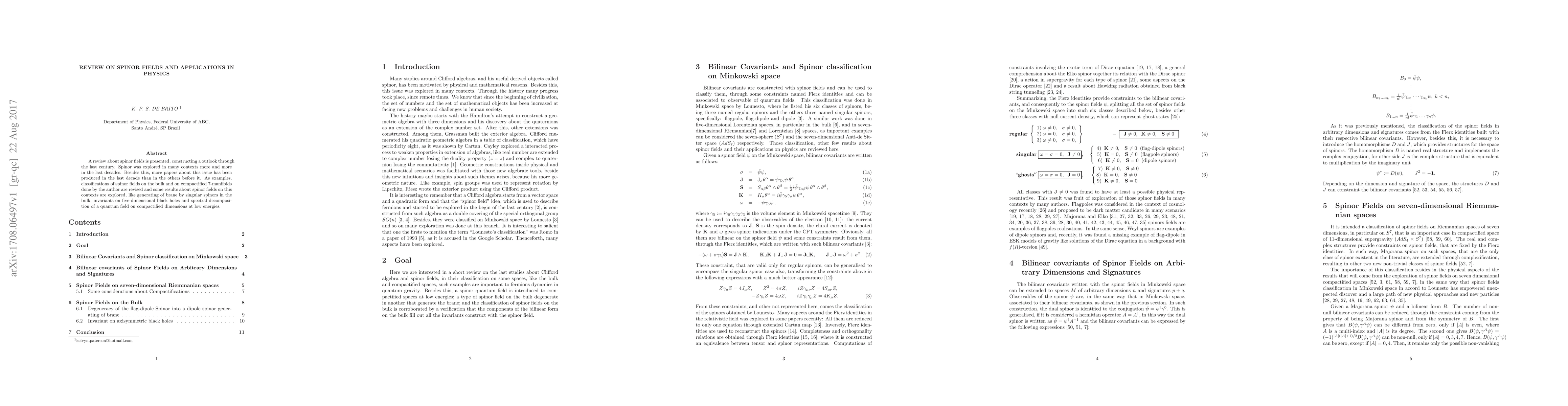 A review about spinor fields is presented, constructing a outlook through the last century. Spinor was explored in many contexts more and more in the last decades. Besides this, more papers about this issue has been produced in the last decade than in the others before it. As examples, classifications of spinor fields on the bulk and on compactified seven-manifolds done by the author are revised and some results about spinor fields on this contexts are explored, like generating of brane by singular spinors in the bulk, invariants on five-dimensional black holes and spectral decomposition of a quantum field on compactified dimensions at low energies.