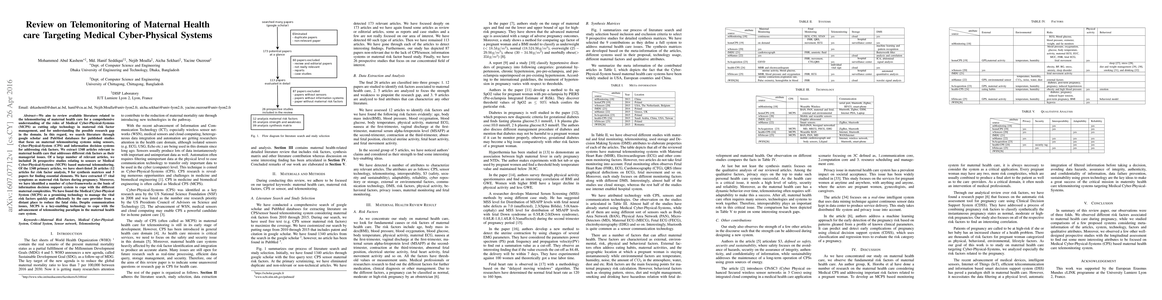 We aim to review available literature related to the telemonitoring of maternal health care for a comprehensive understanding of the roles of Medical Cyber-Physical-Systems (MCPS) as cutting edge technology in maternal risk factor management, and for understanding the possible research gap in the domain. In this regard, we search literature through google scholar and PubMed databases for published studies that focus on maternal telemonitoring systems using sensors, Cyber-Physical-System (CPS) and information decision systems for addressing risk factors We extract 1340 articles relevant to maternal health care that addresses different risk factors as their managerial issues. Of a large number of relevant articles, we included 26 prospective studies relating to sensors or Medical Cyber-Physical-Systems (MCPS) based maternal telemonitoring. Of the 1340 primary articles, we have short-listed 26 articles (12 articles for risk factor analysis, 9 for synthesis matrices and 5 papers for finding essential elements. We have extracted 17 vital symptoms as maternal risk factors during pregnancy. Moreover, we have identified a number of cyber-frameworks as the basis of information decision support system to cope with the different maternal complexities. We have found the Medical Cyber-Physical System (MCPS) as a promising technology to manage the vital risk factors quickly and efficiently by the care provider from a distant place to reduce the fatal risks. Despite communication issues, MCPS is a key-enabling technology to cope with the advancement of telemonitoring paradigm in the maternal health care system.