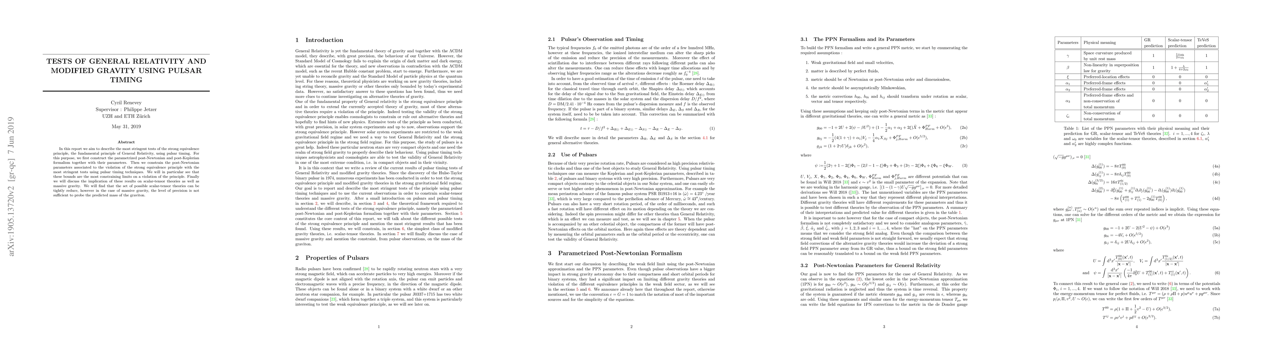 This review examines the most rigorous tests of General Relativity's strong equivalence principle using pulsar timing, constraining parameters that violate this principle and discussing implications for scalar-tensor theories and massive gravity, while noting the precision limits for probing the graviton's mass.
