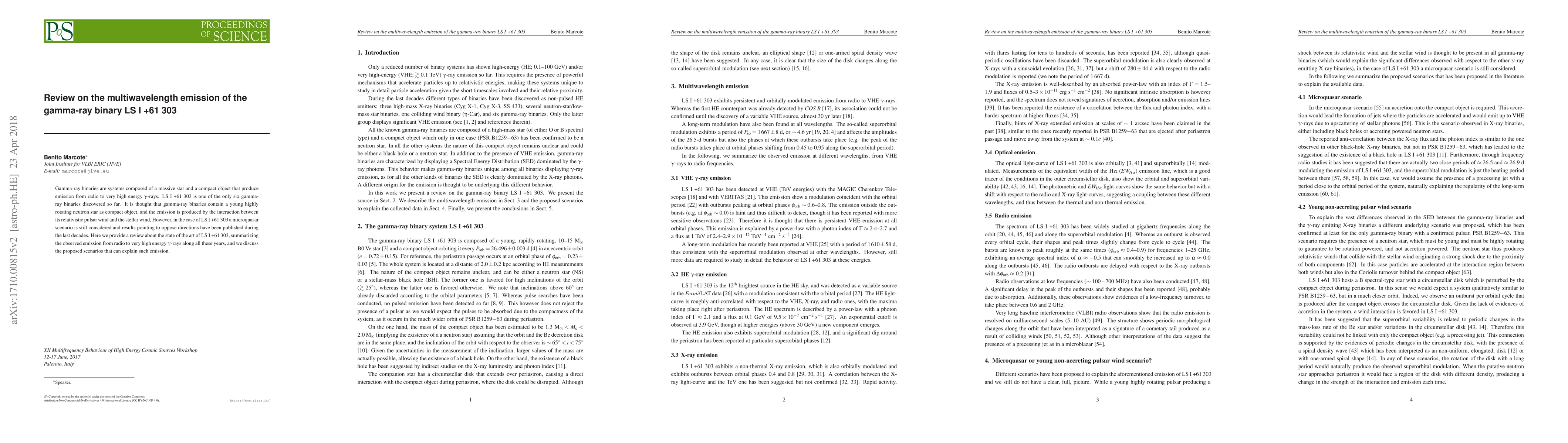 This paper reviews the multiwavelength emission of gamma-ray binary LS I +61 303, discussing proposed scenarios that explain its emission from radio to high-energy gamma-rays, including a microquasar scenario versus a neutron star.