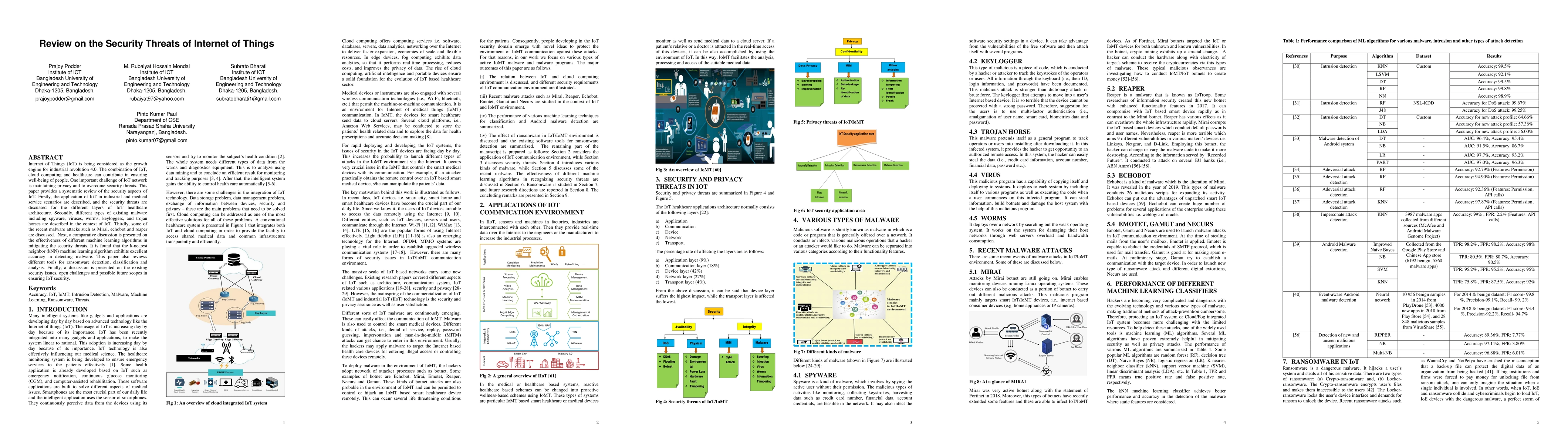 This paper systematically reviews the security threats in IoT, highlighting its applications in industrial and healthcare sectors and discussing various types of IoT-specific malware. It examines recent attacks and evaluates machine learning algorithms, finding k-nearest neighbor effective for malware detection, and concludes with existing security challenges and future directions for IoT security.