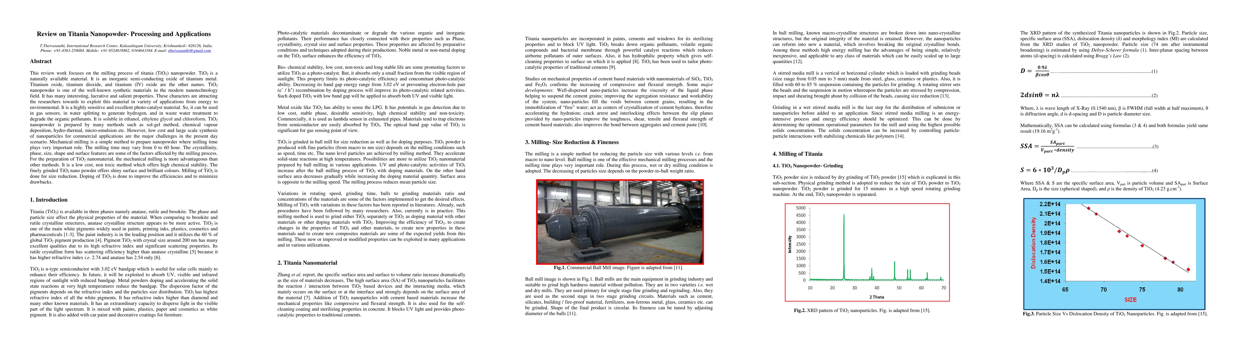 This review work focuses on the milling process of titania (TiO2) nanopowder. TiO2 is a naturally available material. It is an inorganic semi-conducting oxide of titanium metal. Titanium oxide, titanium dioxide, and titanium (IV) oxide are the other names. TiO2 nanopowder is one of the well-known synthetic materials in the modern nanotechnology field. It has many interesting, lucrative and salient properties. These characters are attracting the researchers towards to exploit this material in variety of applications from energy to environmental. It is a highly sensitive and excellent photo-catalyst material. So, it can be used in gas sensors, in water splitting to generate hydrogen, and in waste water treatment to degrade the organic pollutants. It is soluble in ethanol, ethylene glycol and chloroform. TiO2 nanopowder is prepared by many methods such as sol-gel method, chemical vapour deposition, hydro-thermal, micro-emulsion etc. However, low cost and large scale synthesis of nanoparticles for commercial applications are the major challenges in the present day scenario. Mechanical milling is a simple method to prepare nanopowder where milling time plays very important role. The milling time may vary from 0 to 60 hour. The crystallinity, phase, size, shape and surface features are some of the factors affected by the milling process. For the preparation of TiO2 nanomaterial, the mechanical milling is more advantageous than other methods. It is a low cost, non toxic method which offers high chemical stability. The finely grinded TiO2 nano powder offers shiny surface and brilliant colours. Milling of TiO2 is done for size reduction. Doping of TiO2 is done to improve the efficiencies and to minimize drawbacks.