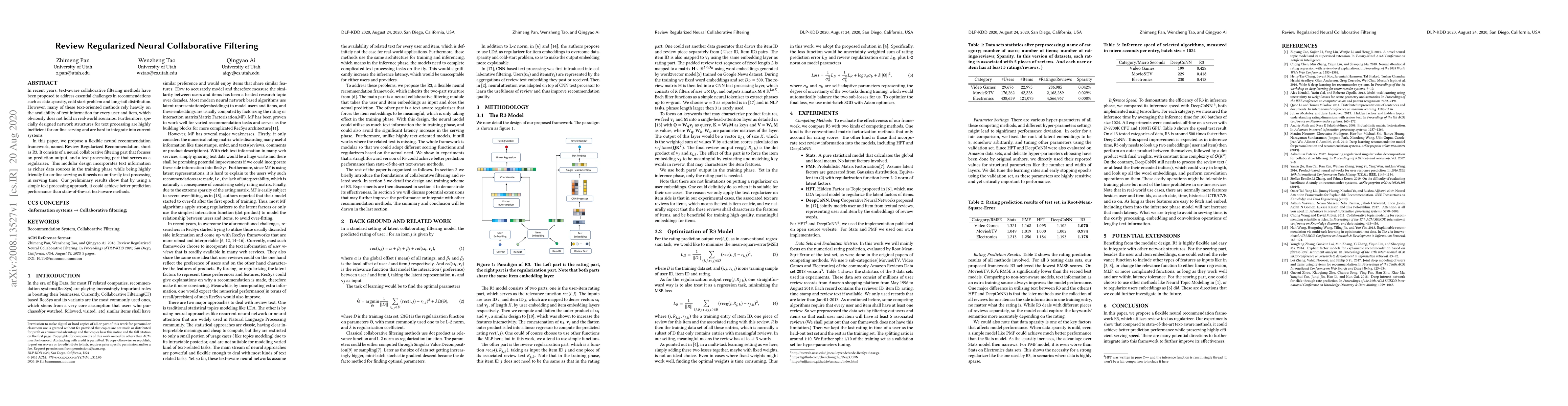 In recent years, text-aware collaborative filtering methods have been proposed to address essential challenges in recommendations such as data sparsity, cold start problem, and long-tail distribution. However, many of these text-oriented methods rely heavily on the availability of text information for every user and item, which obviously does not hold in real-world scenarios. Furthermore, specially designed network structures for text processing are highly inefficient for on-line serving and are hard to integrate into current systems. In this paper, we propose a flexible neural recommendation framework, named Review Regularized Recommendation, short as R3. It consists of a neural collaborative filtering part that focuses on prediction output, and a text processing part that serves as a regularizer. This modular design incorporates text information as richer data sources in the training phase while being highly friendly for on-line serving as it needs no on-the-fly text processing in serving time. Our preliminary results show that by using a simple text processing approach, it could achieve better prediction performance than state-of-the-art text-aware methods.