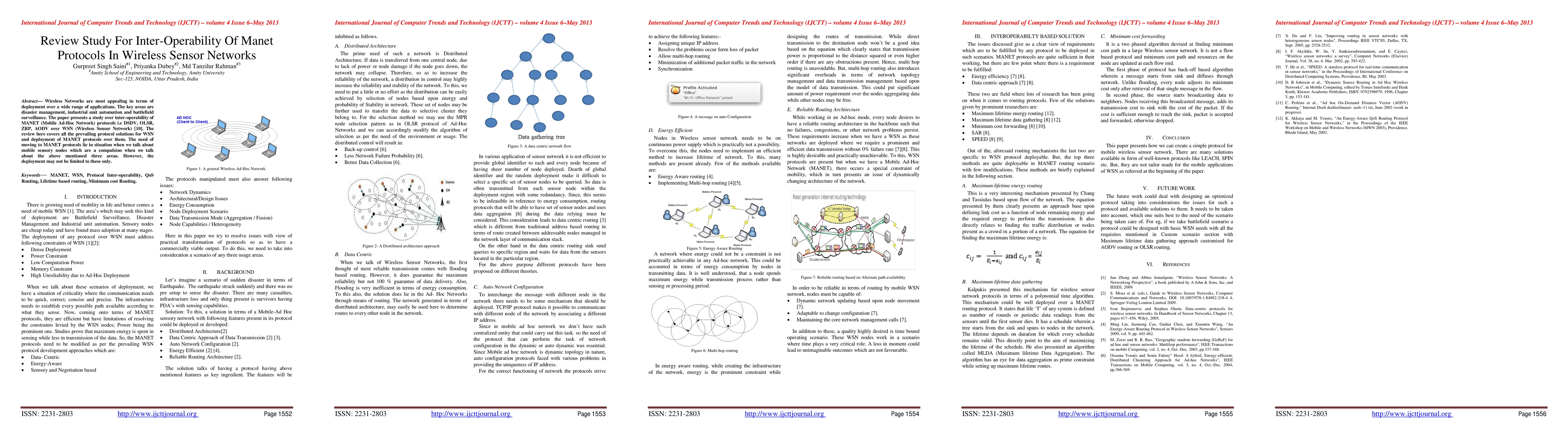 Wireless Networks are most appealing in terms of deployment over a wide range of applications. The key areas are disaster management, industrial unit automation and battlefield surveillance. The paper presents a study over inter-operability of MANET (Mobile Ad-Hoc Network) protocols i.e DSDV, OLSR, ZRP, AODV over WSN (Wireless Sensor Network) [10]. The review here covers all the prevailing protocol solutions for WSN and deployment of MANET protocols over them. The need of moving to MANET protocols lie in situation when we talk about mobile sensory nodes which are a compulsion when we talk about the above mentioned three areas. However, the deployment may not be limited to these only.