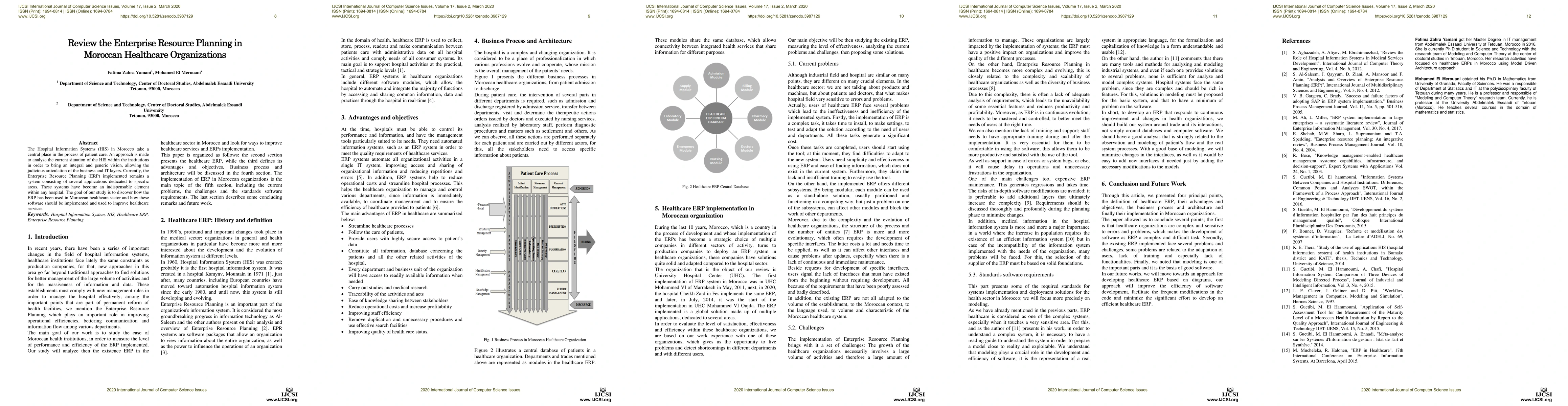 The Hospital Information Systems (HIS) in Morocco take a central place in the process of patient care. An approach is made to analyze the current situation of the HIS within the institutions in order to bring an integral and generic vision, allowing the judicious articulation of the business and IT layers. Currently, the Enterprise Resource Planning (ERP) implemented remains a system consisting of several applications dedicated to specific areas. These systems have become an indispensable element within any hospital. The goal of our study is to discover how the ERP has been used in Moroccan healthcare sector and how these software should be implemented and used to improve healthcare services.