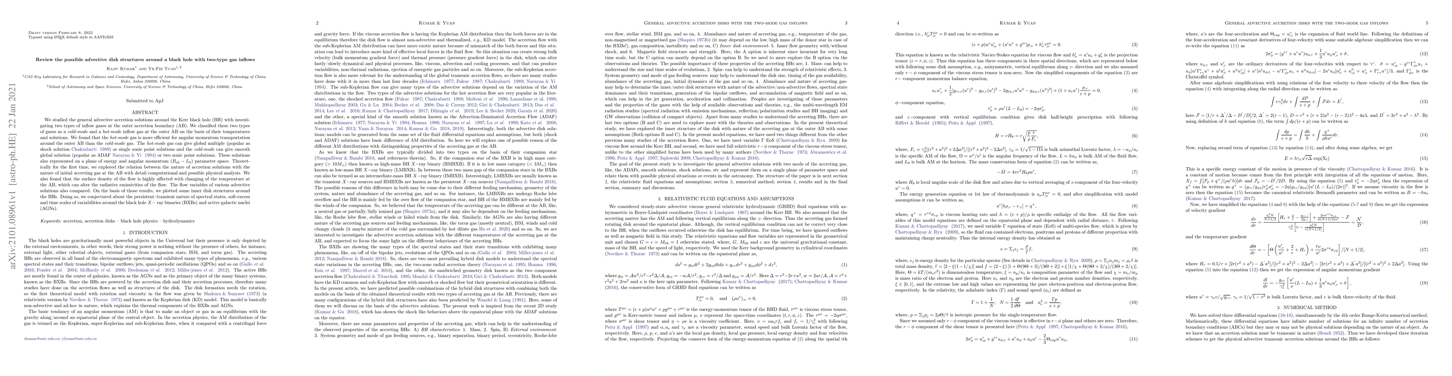 We studied the general advective accretion solutions around the Kerr black hole (BH) with investigating two types of inflow gases at the outer accretion boundary (AB). We classified these two types of gases as a \cm and a \hm inflow gas at the outer AB on the basis of their temperatures and solutions. We found that the \hm gas is more efficient for angular momentum transportation around the outer AB than the \cm gas. The \hm gas can give global multiple \cite[popular as shock solution][]{c89} or single sonic point solutions and the \cm can give smooth global solution \cite[popular as ADAF][]{ny94} or two sonic point solutions. These solutions also represented on a plane of energy and angular momentum ($\be-L_0$) parameter space. Theoretically for the first time, we explored the relation between the nature of accretion solutions with the nature of initial accreting gas at the AB with detail computational and possible physical analysis. We also found that the surface density of the flow is highly affected with changing of the temperature at the AB, which can alter the radiative emissivities of the flow. The flow variables of various advective solutions also compared. On the basis of those results, we plotted some inner disk structures around the BHs. Doing so, we conjectured about the persistent/transient nature of spectral states, soft-excess and time scales of variabilities around the black hole $X-$ ray binaries (BXBs) and active galactic nuclei (AGNs).