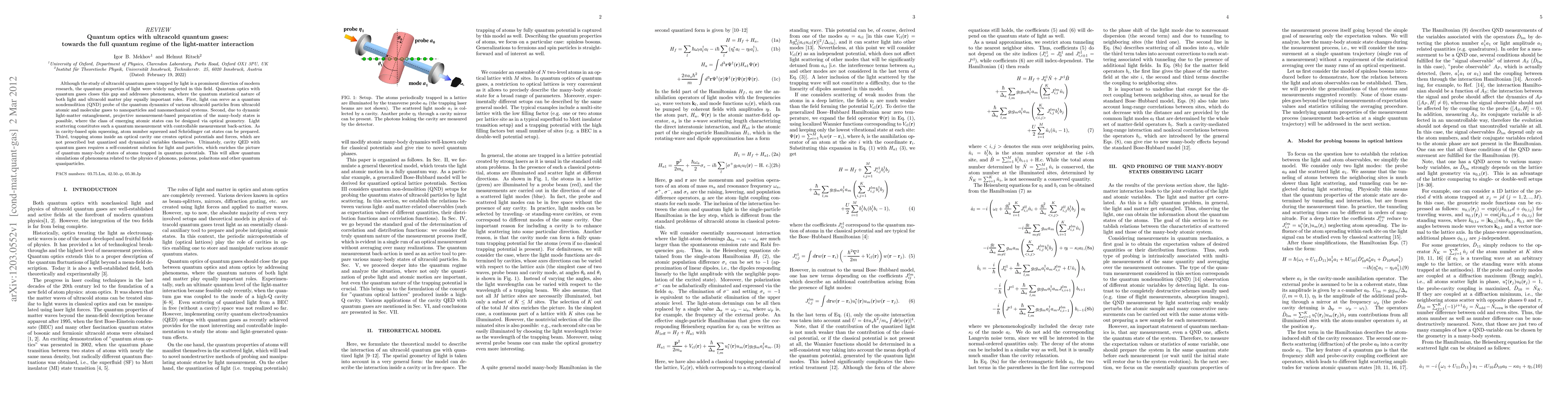 Although the study of ultracold quantum gases trapped by light is a prominent direction of modern research, the quantum properties of light were widely neglected in this field. Quantum optics with quantum gases closes this gap and addresses phenomena, where the quantum statistical nature of both light and ultracold matter play equally important roles. First, light can serve as a quantum nondemolition (QND) probe of the quantum dynamics of various ultracold particles from ultracold atomic and molecular gases to nanoparticles and nanomechanical systems. Second, due to dynamic light-matter entanglement, projective measurement-based preparation of the many-body states is possible, where the class of emerging atomic states can be designed via optical geometry. Light scattering constitutes such a quantum measurement with controllable measurement back-action. As in cavity-based spin squeezing, atom number squeezed and Schroedinger cat states can be prepared. Third, trapping atoms inside an optical cavity one creates optical potentials and forces, which are not prescribed but quantized and dynamical variables themselves. Ultimately, cavity QED with quantum gases requires a self-consistent solution for light and particles, which enriches the picture of quantum many-body states of atoms trapped in quantum potentials. This will allow quantum simulations of phenomena related to the physics of phonons, polarons, polaritons and other quantum quasiparticles.
